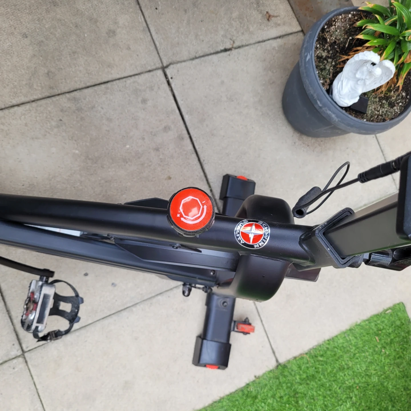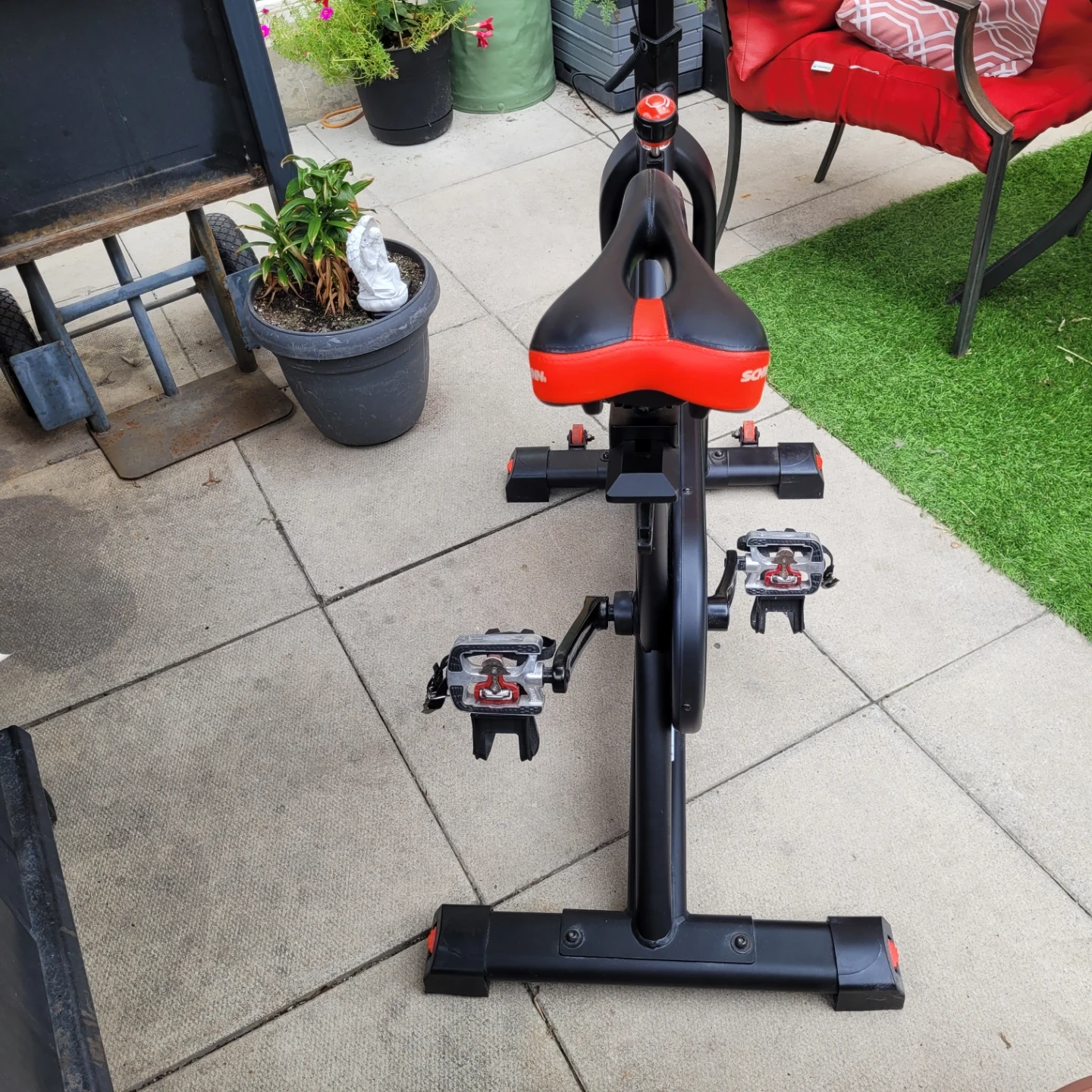 This is a Schwinn IC3 indoor cycle bike. It's black with red accents. Features adjustable seat and handlebars. The bike has toe cages on the pedals. Great for home workouts!