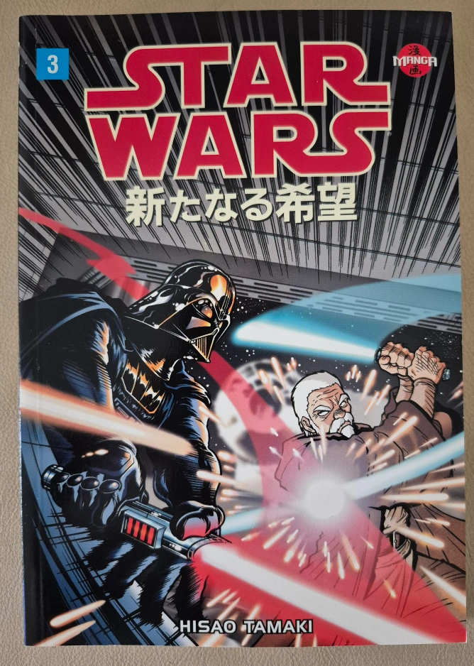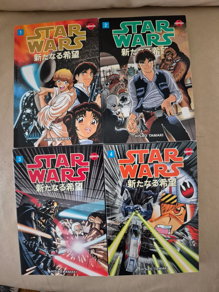 Complete set of four Star Wars A New Hope manga by Hisao Tamaki. Features iconic characters and scenes from the Star Wars universe. Collectible manga.