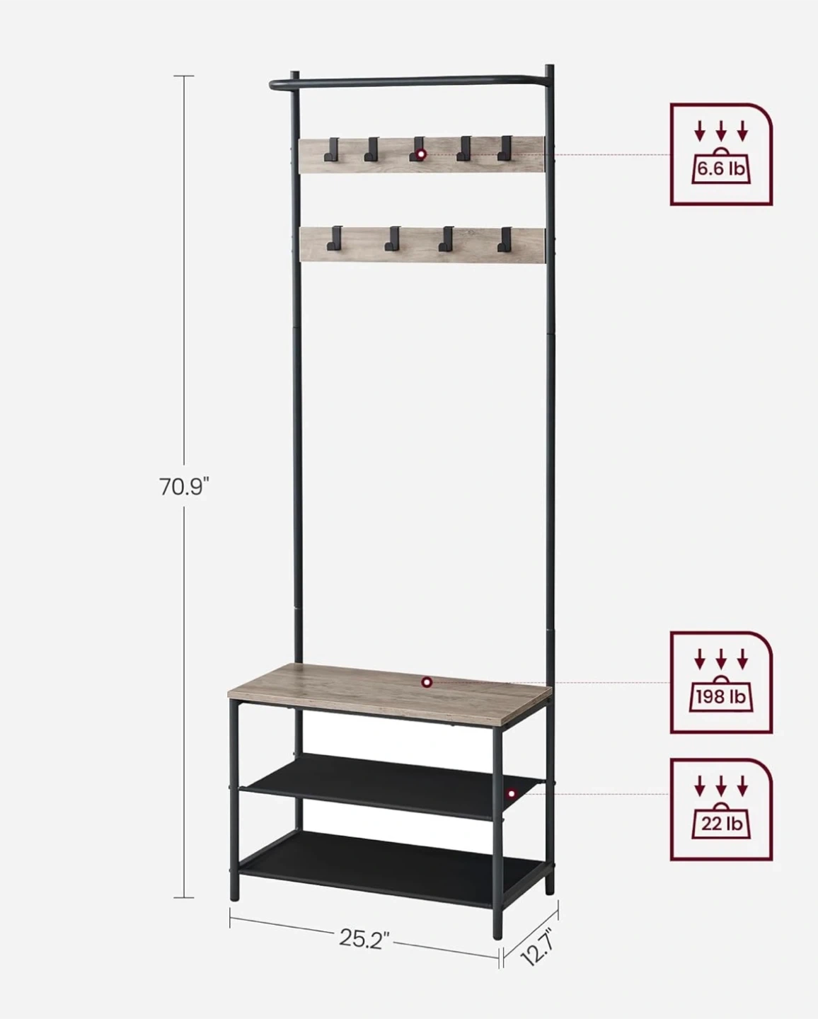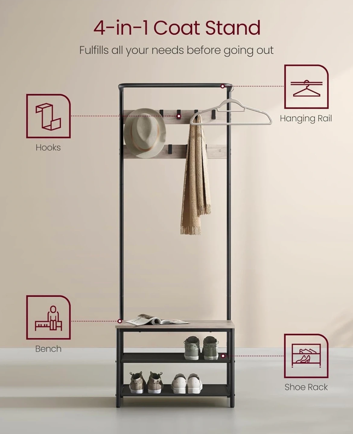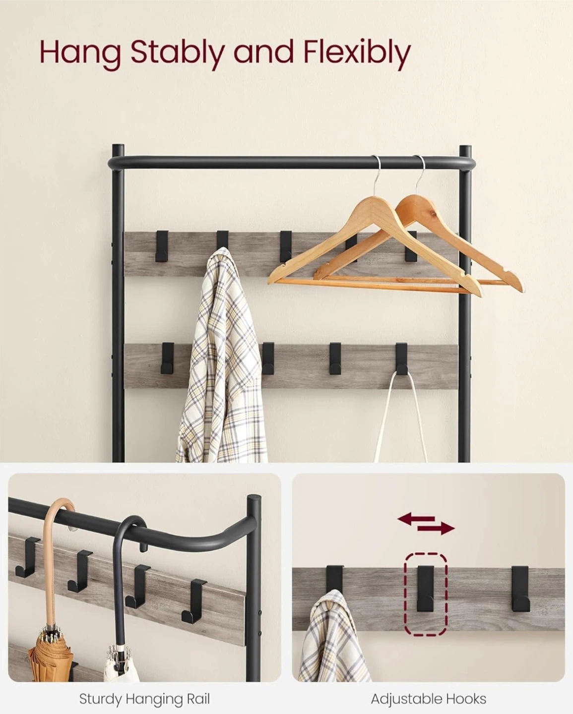 • 9 movable hooks for coats, bags, hats, and scarves