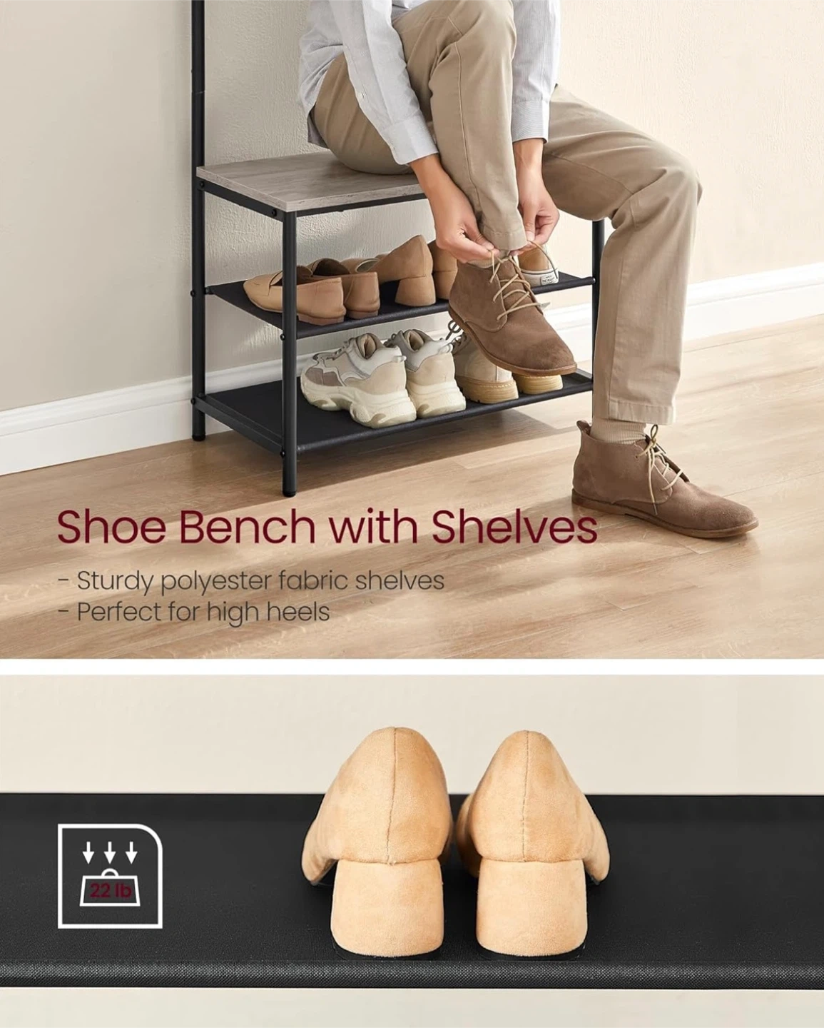 • Shoe rack with durable fabric shelves