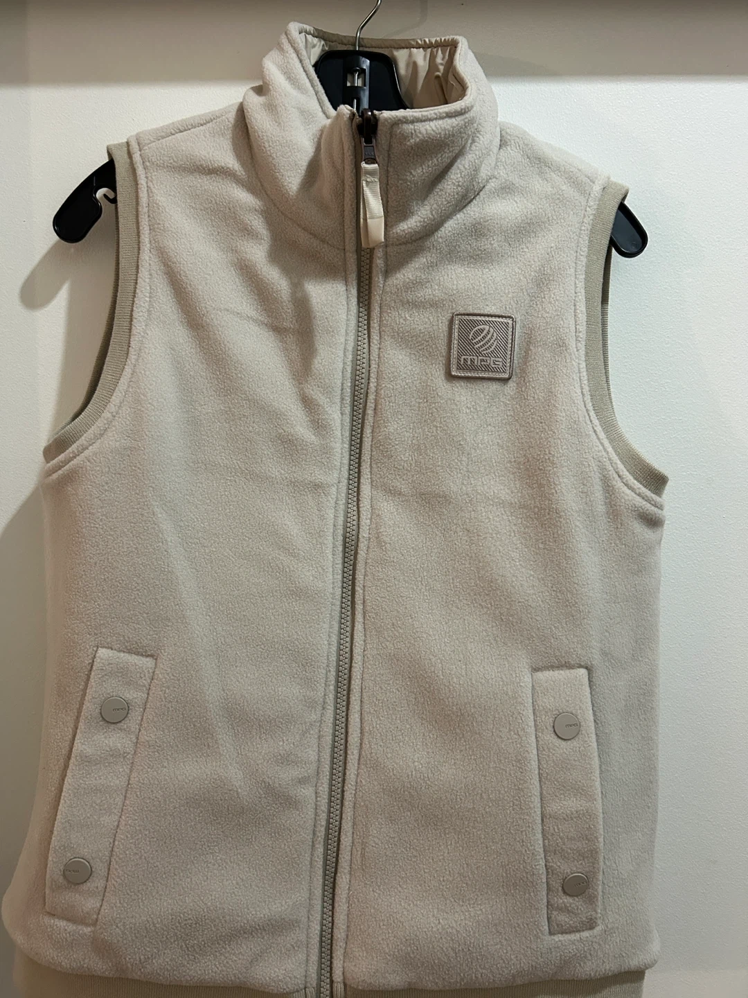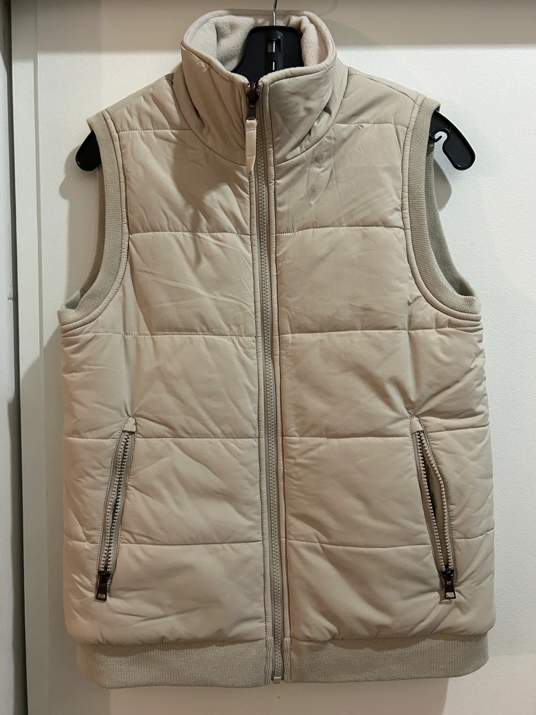 This MPG vest is a light beige colour. It's a puffer-style vest with a zippered front and zippered pockets. The collar is a mock neck style. Reversible worn once
