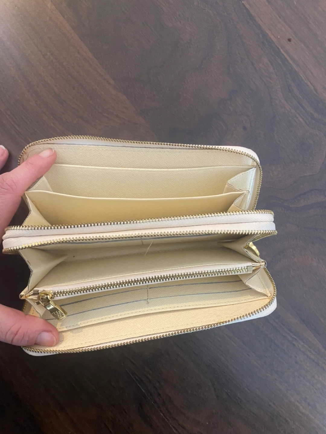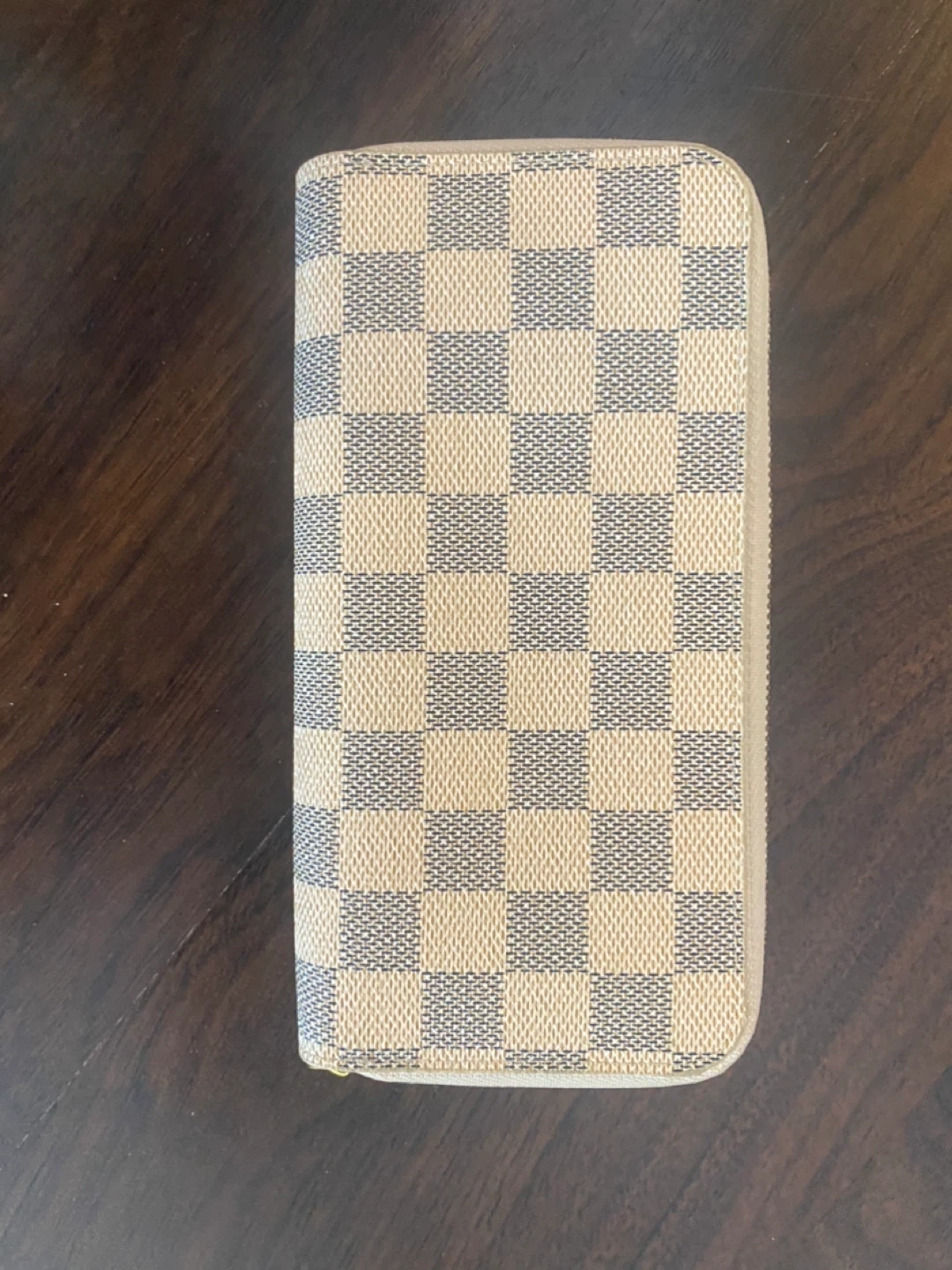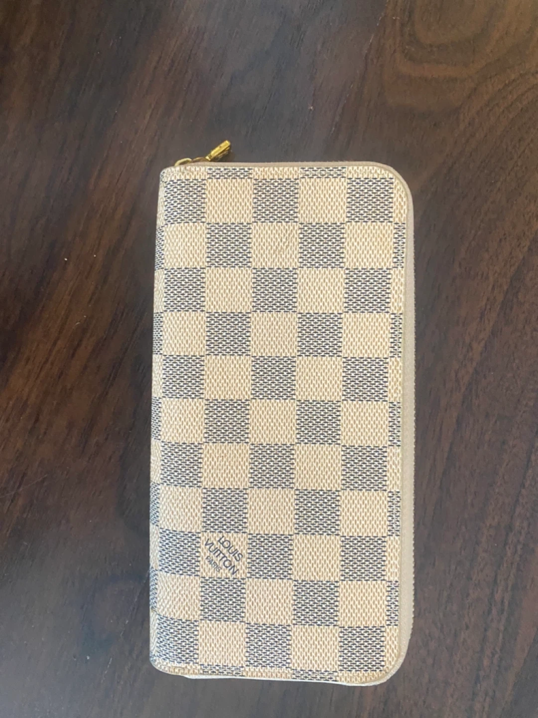 This Louis Vuitton Zippy wallet comes in the Damier Azur pattern. It's a zip-around style with multiple card slots and compartments inside. Gold-tone hardware completes the look.