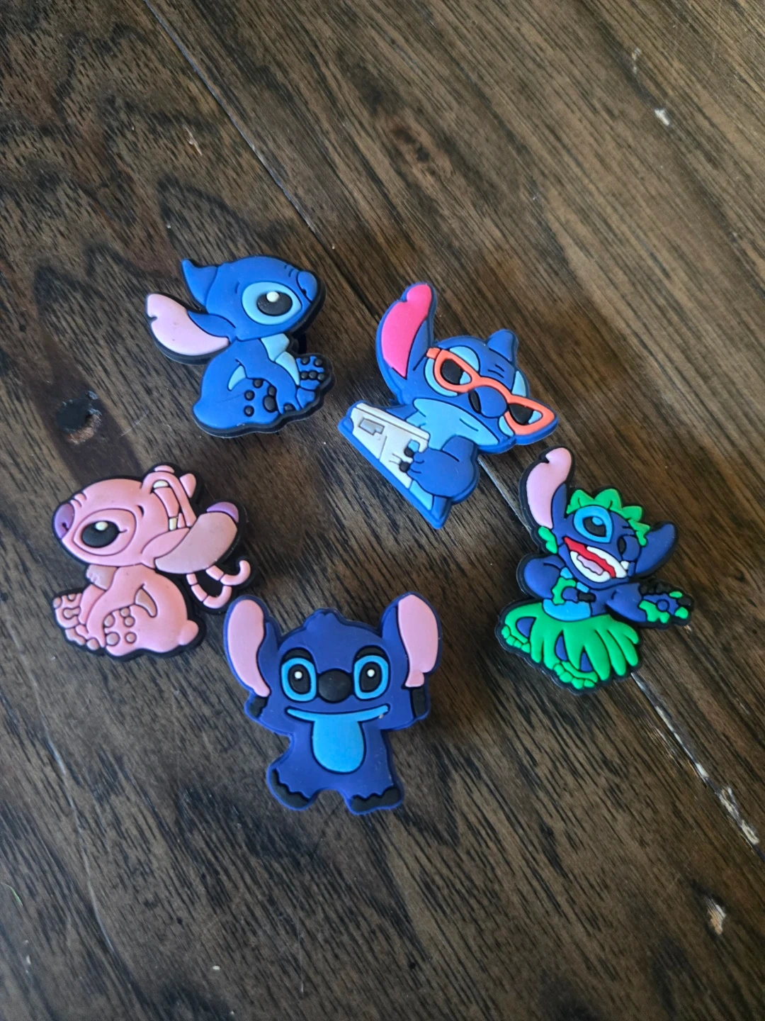 Set of five Stitch-themed charms. Includes blue Stitch with pink ears, pink Stitch, blue Stitch with sunglasses, and two other blue Stitch designs. These are suitable for customizing shoes or bags.