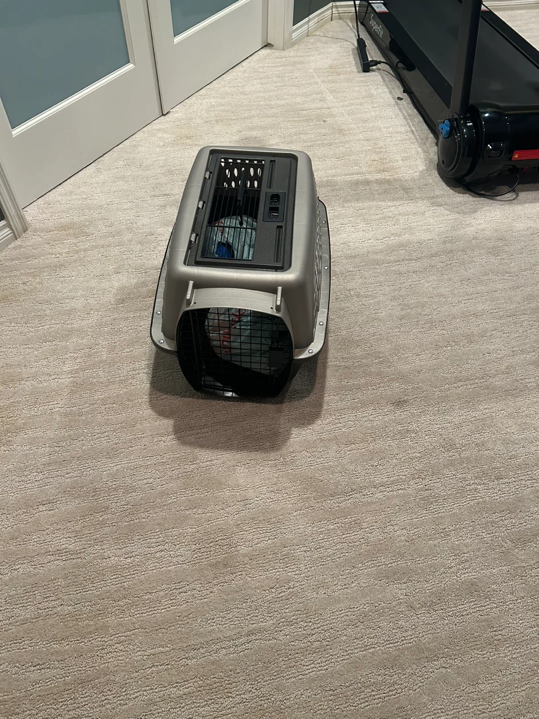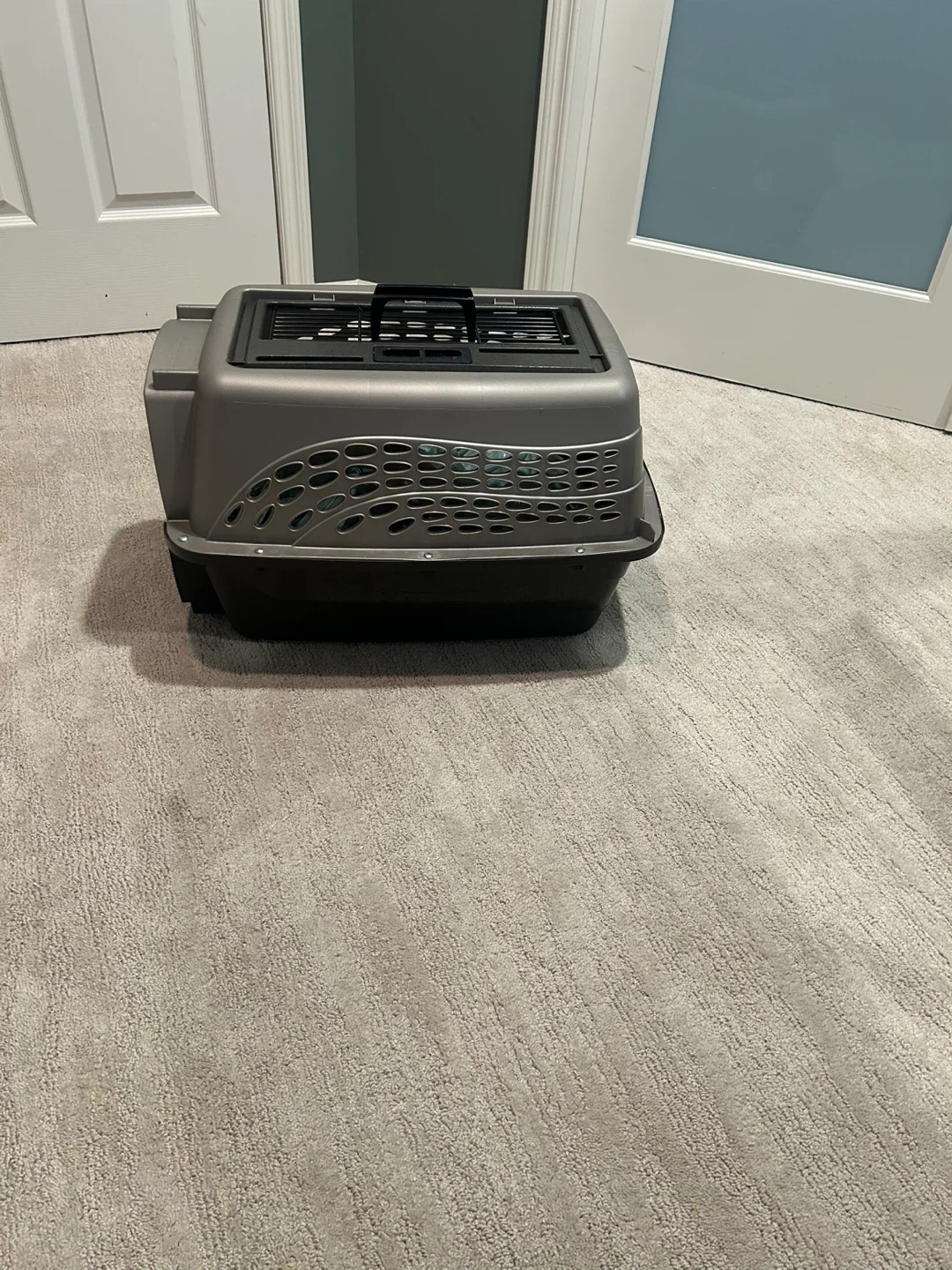 This is a sturdy pet carrier crate for small to medium pets. It's made of durable plastic with ventilation on all sides for comfort. The top handle makes it easy to carry.