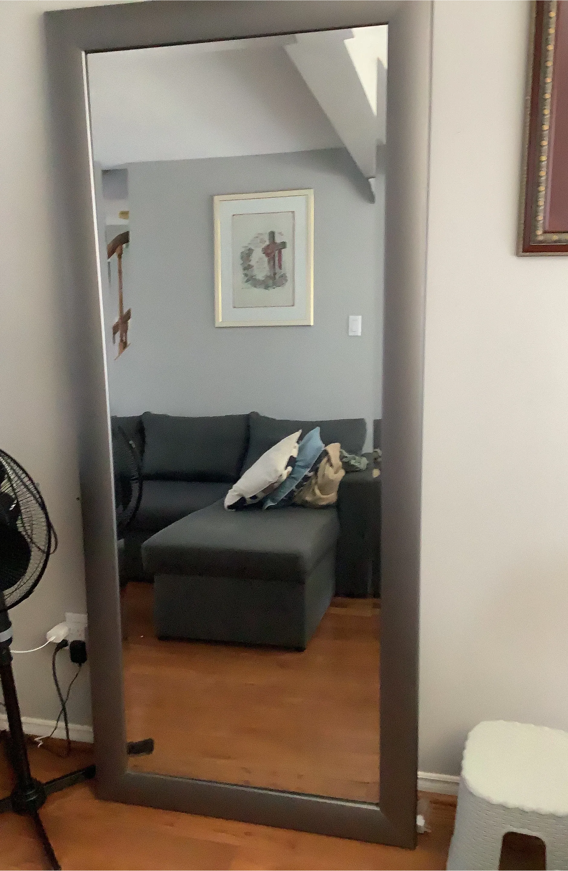 A full-length mirror with a sleek, modern grey frame. It's perfect for checking your outfit before you head out the door. The mirror's generous size makes any room feel larger and brighter. Great for bedrooms, hallways, or living spaces!