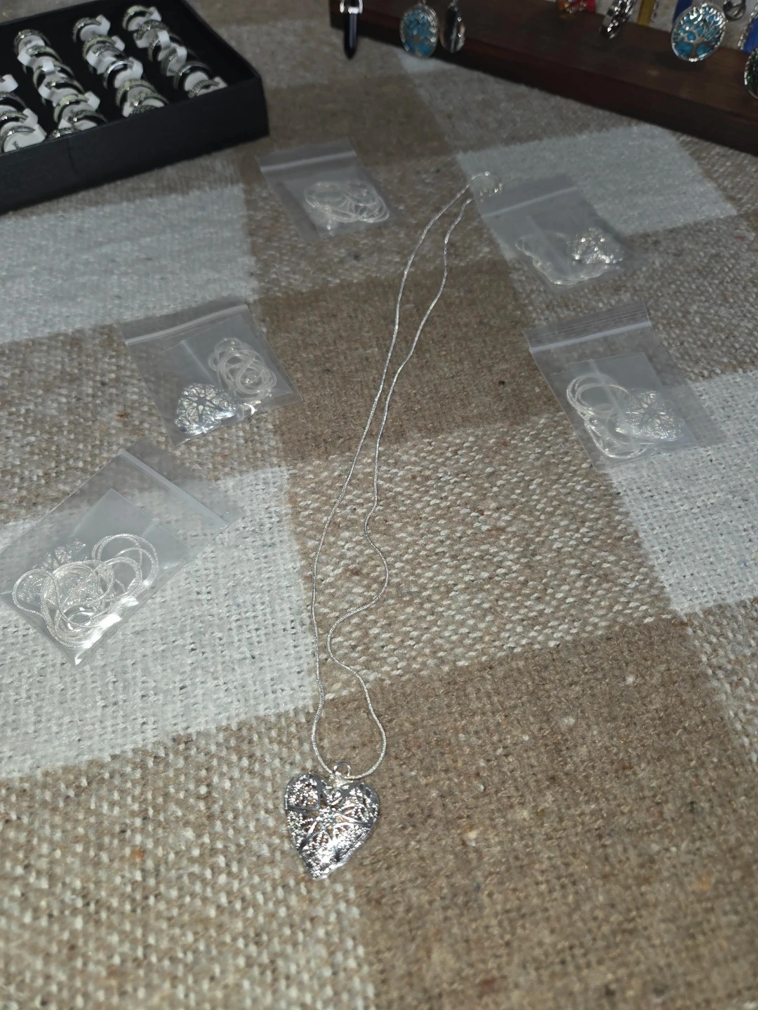 This collection includes a variety of fashion rings with different designs and pendants, along with several stone-embellished necklaces. The rings are made of metal, and the necklaces feature various stone types and charms. They're suitable for adding a unique touch to any outfit. The 925 silver heart pendant and chain.