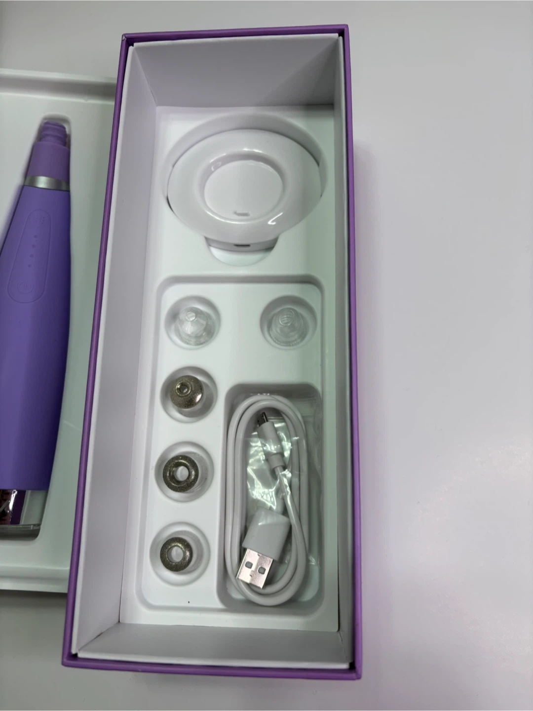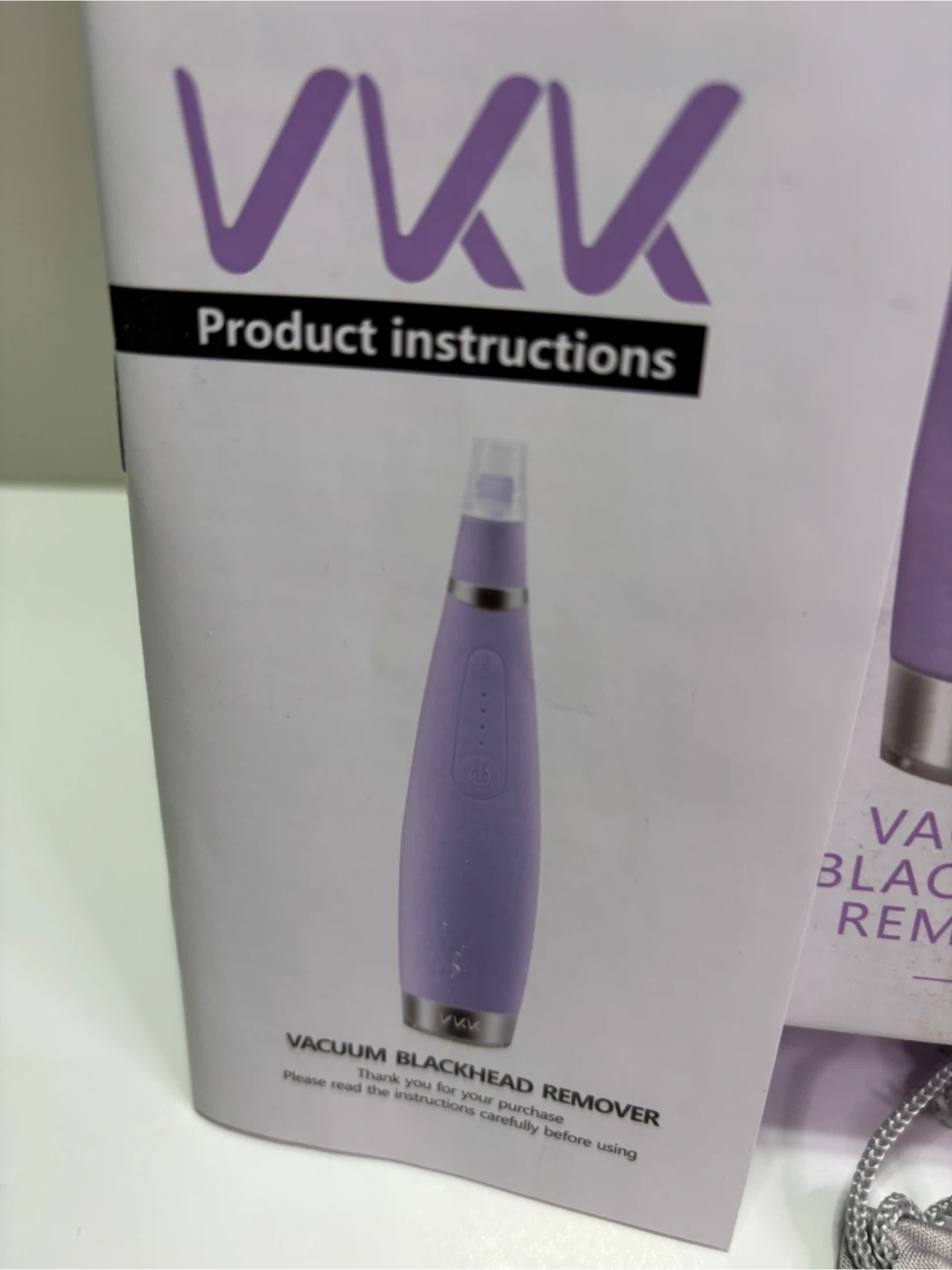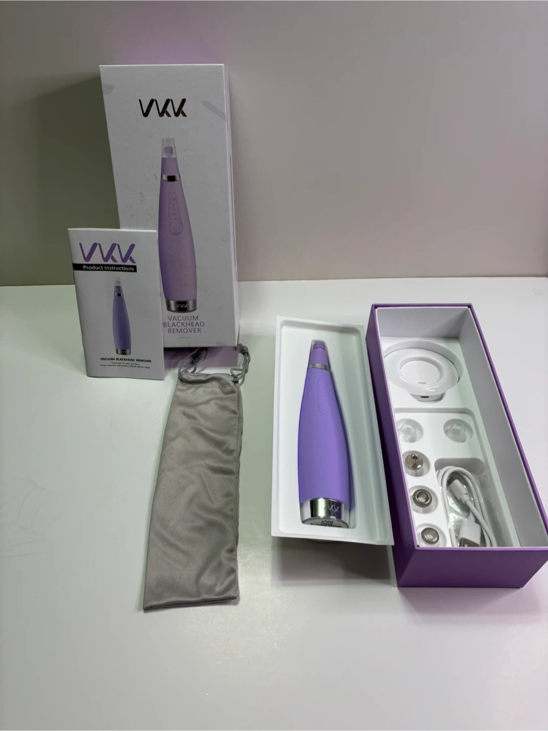 This VVK vacuum blackhead remover comes in a lovely lavender colour. It includes a USB charging cable and multiple interchangeable suction heads for different areas. It's powered by a rechargeable battery and has multiple intensity levels.