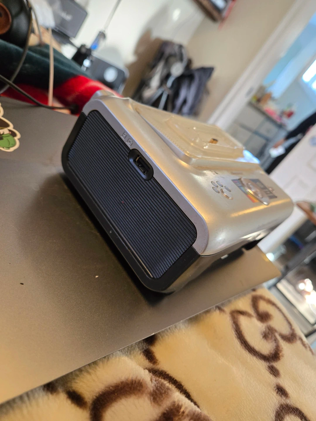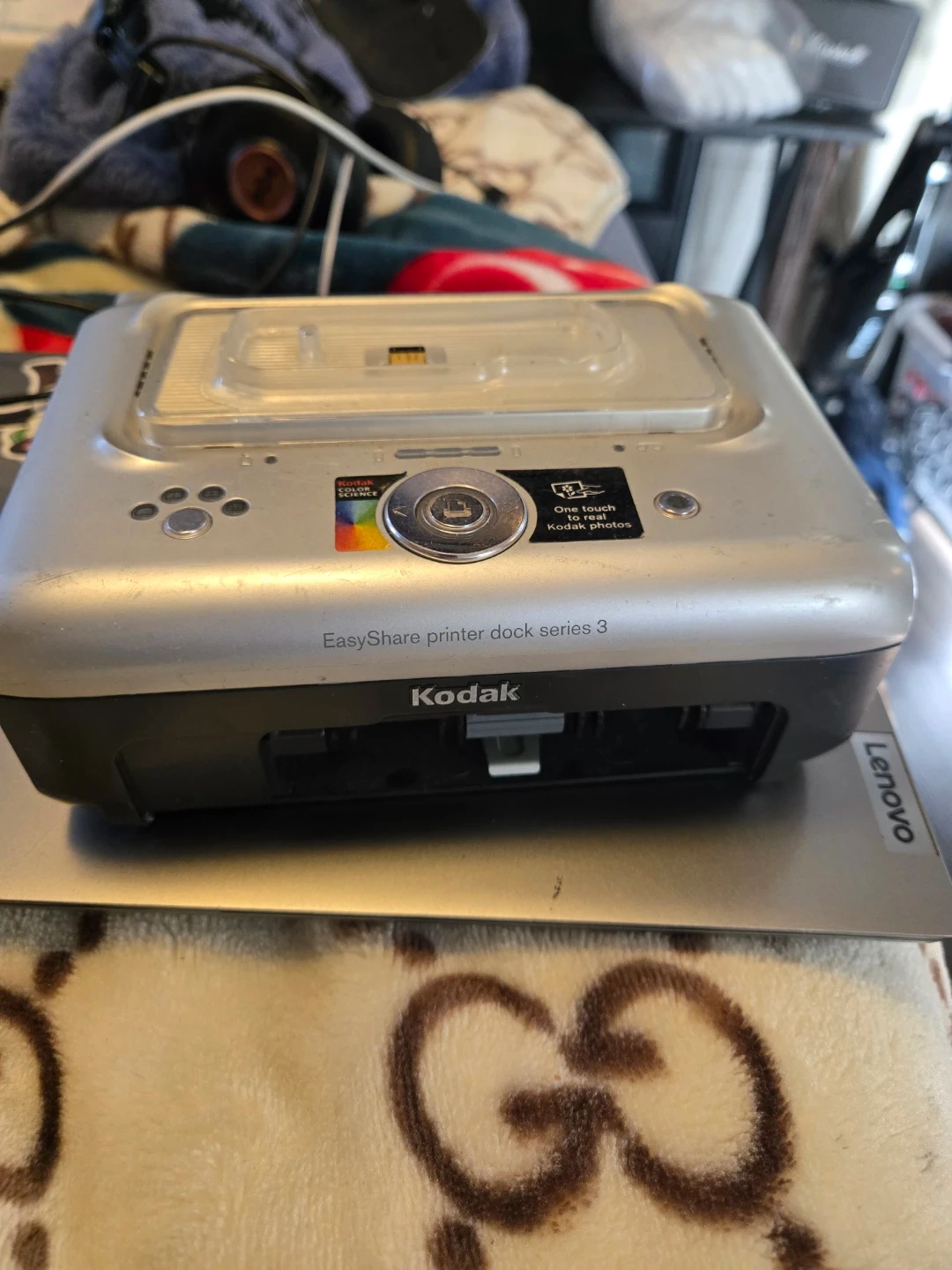 This is a Kodak EasyShare printer dock series 3. It's a silver and black digital photo printer dock. It has a one-touch button for printing photos. It also includes a USB port and a card slot for easy connectivity.