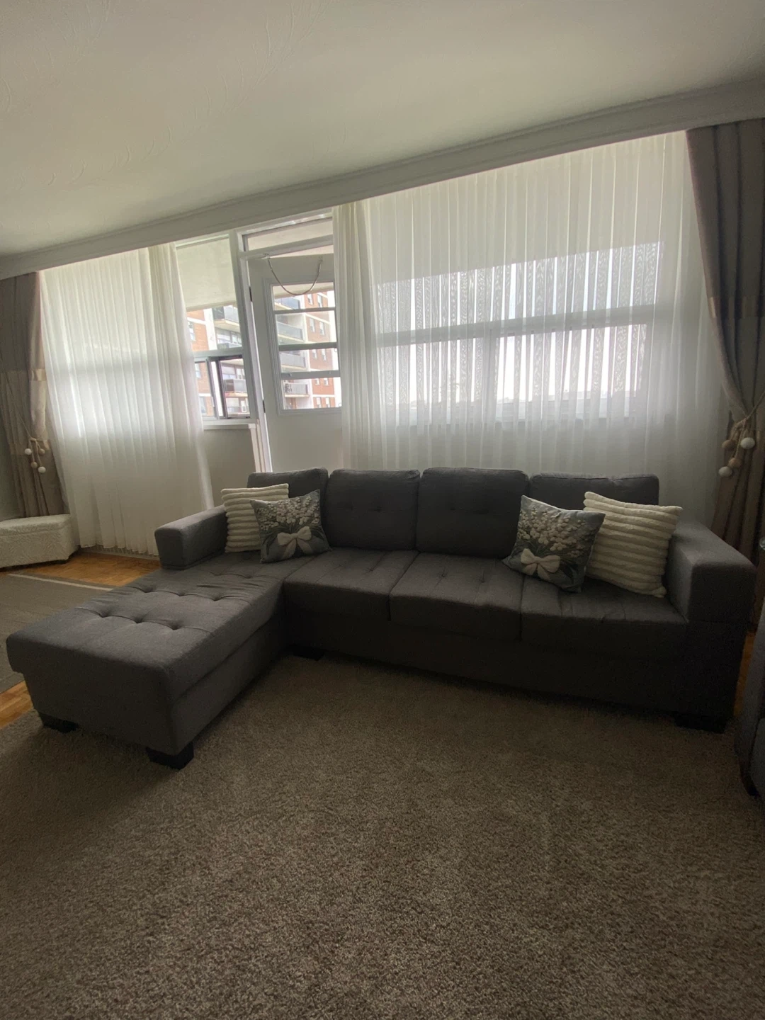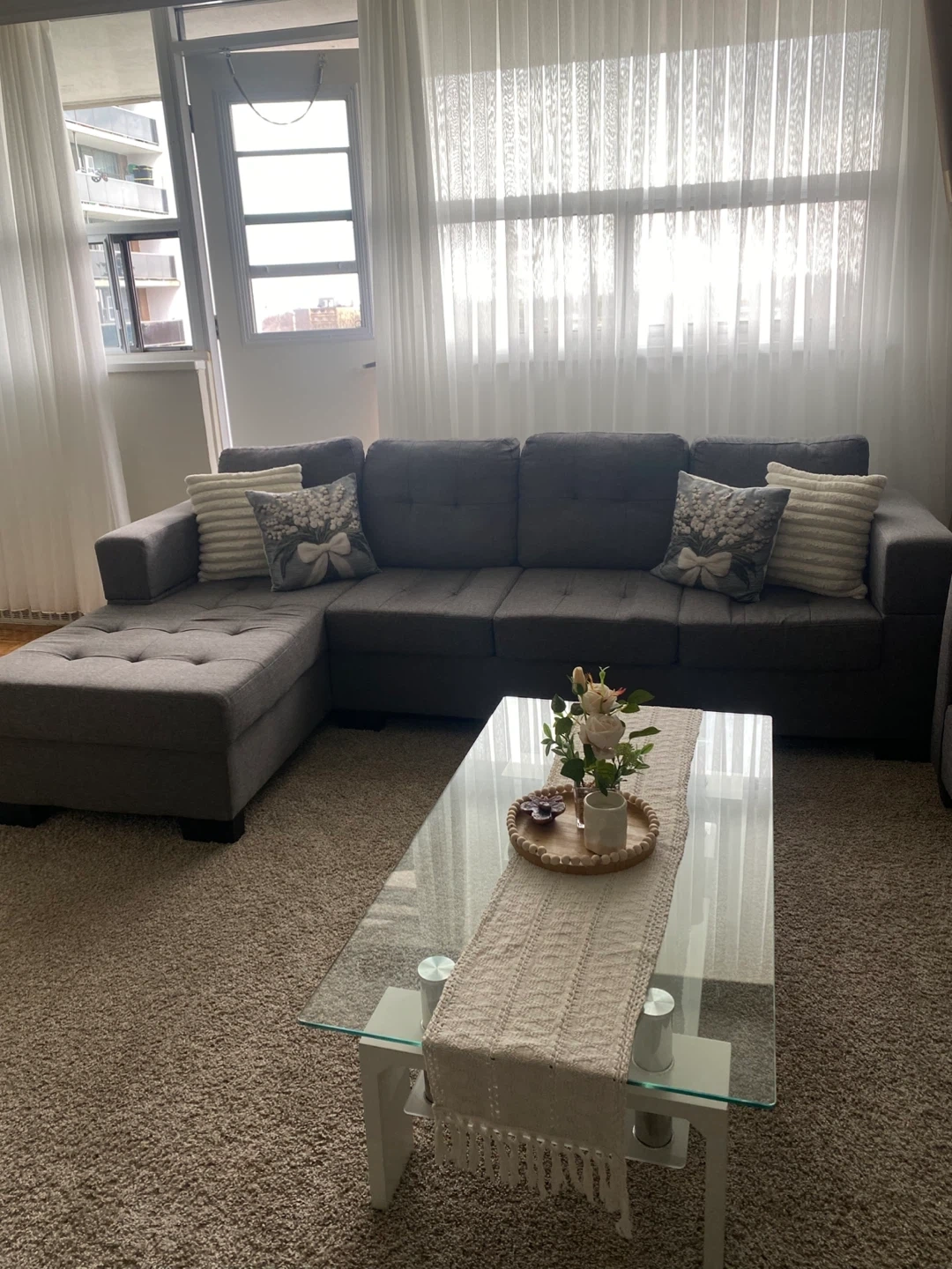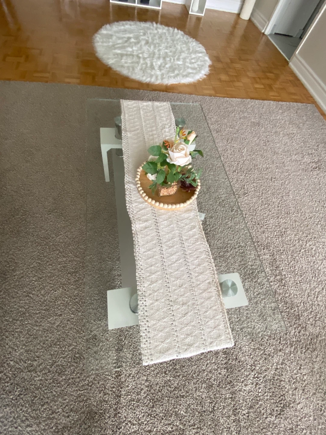 Modern glass top coffee table with a clean white base. It's a spacious surface for your living room. Perfect for holding drinks and decor!