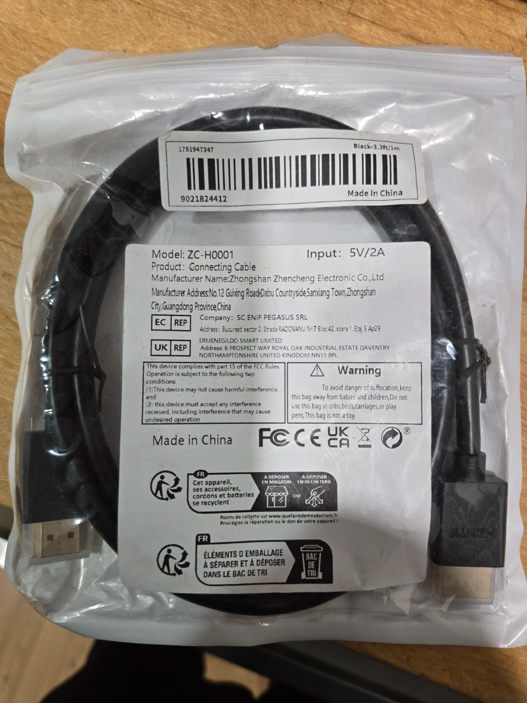 This is a ZC-H0001 connecting cable. It supports an input of 5V/2A. The cable is 1 meter (3.3ft) long and black. It's made in China.