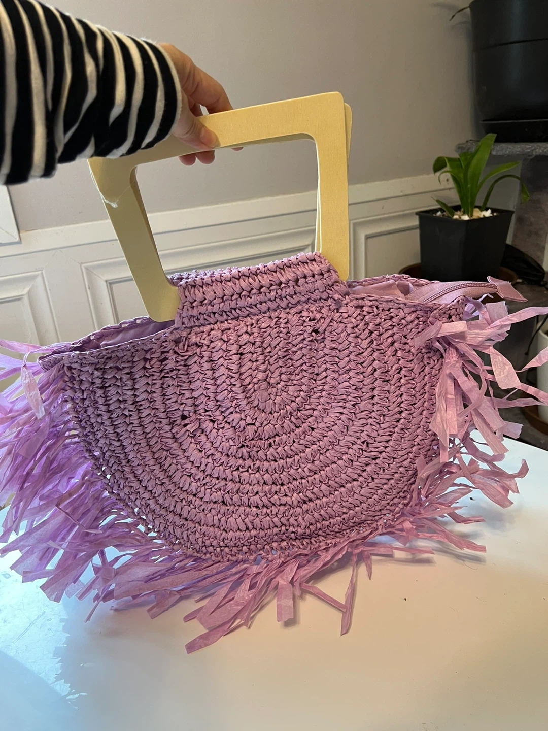 A lovely lavender straw tote bag with fun fringed trim along the bottom. It features light wood handles and a zipper closure for security. This bag's unique design makes it a stylish accessory for spring and summer outings!
