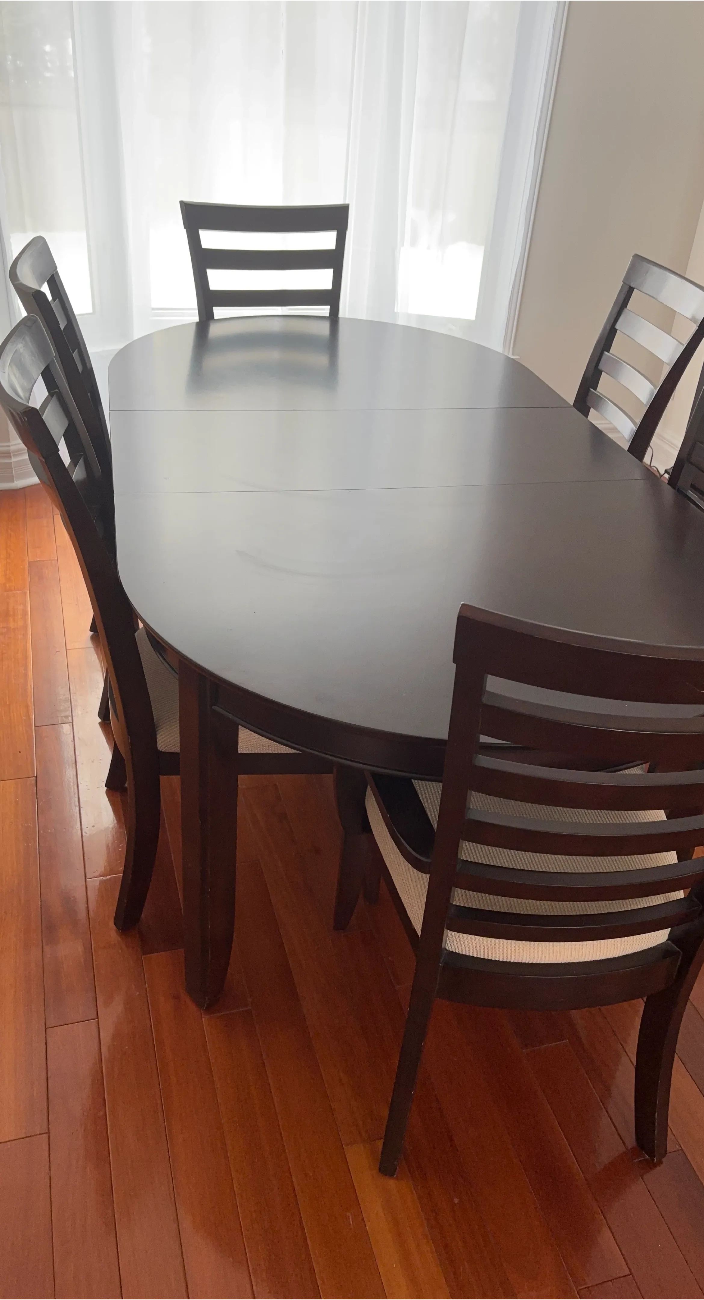 A beautiful dark wood dining table and chairs set. It features a smooth, oval-shaped tabletop with a leaf insert for extension. The chairs have a slatted back design and fabric seats. This set is perfect for family dinners or entertaining guests!