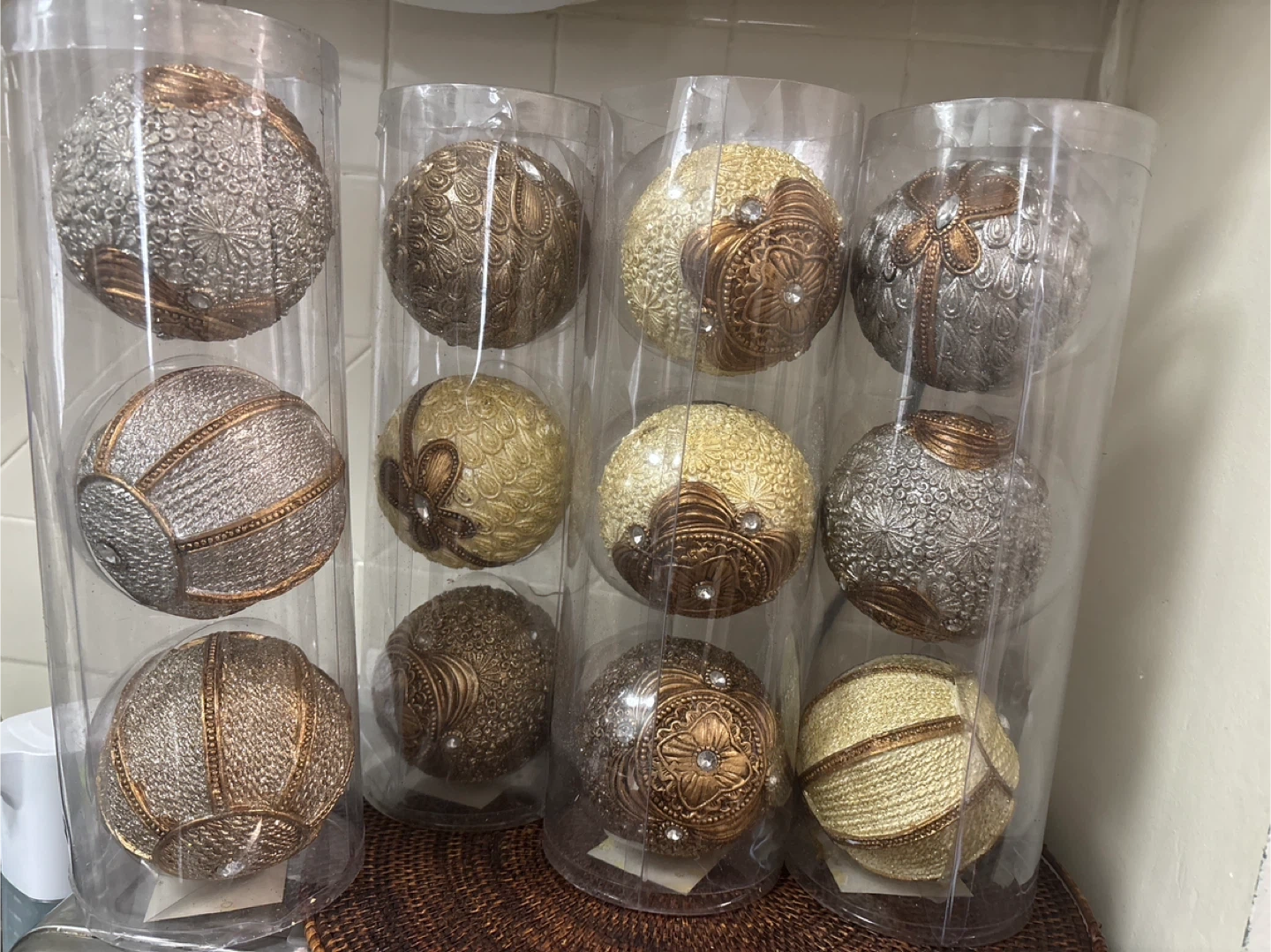 This set includes 12 decorative orbs in a mix of gold and silver finishes. They feature intricate embossed patterns and some have small rhinestone accents. Each orb is packaged individually in a clear plastic cylinder.