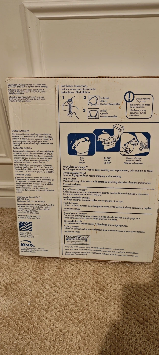 This Bemis toilet seat features Easy-Clean & Change twist hinges for simple seat removal and replacement. It's made with durable molded wood and has a finish that resists chipping and scratching. It fits all manufacturers' round toilet bowls.