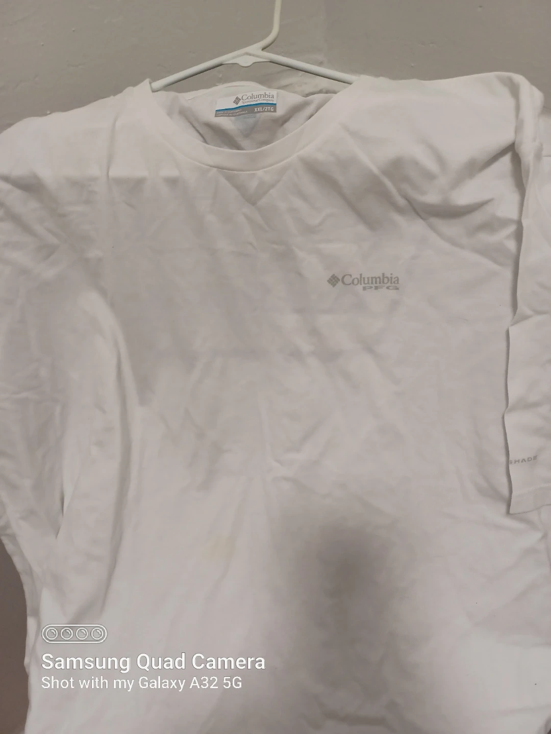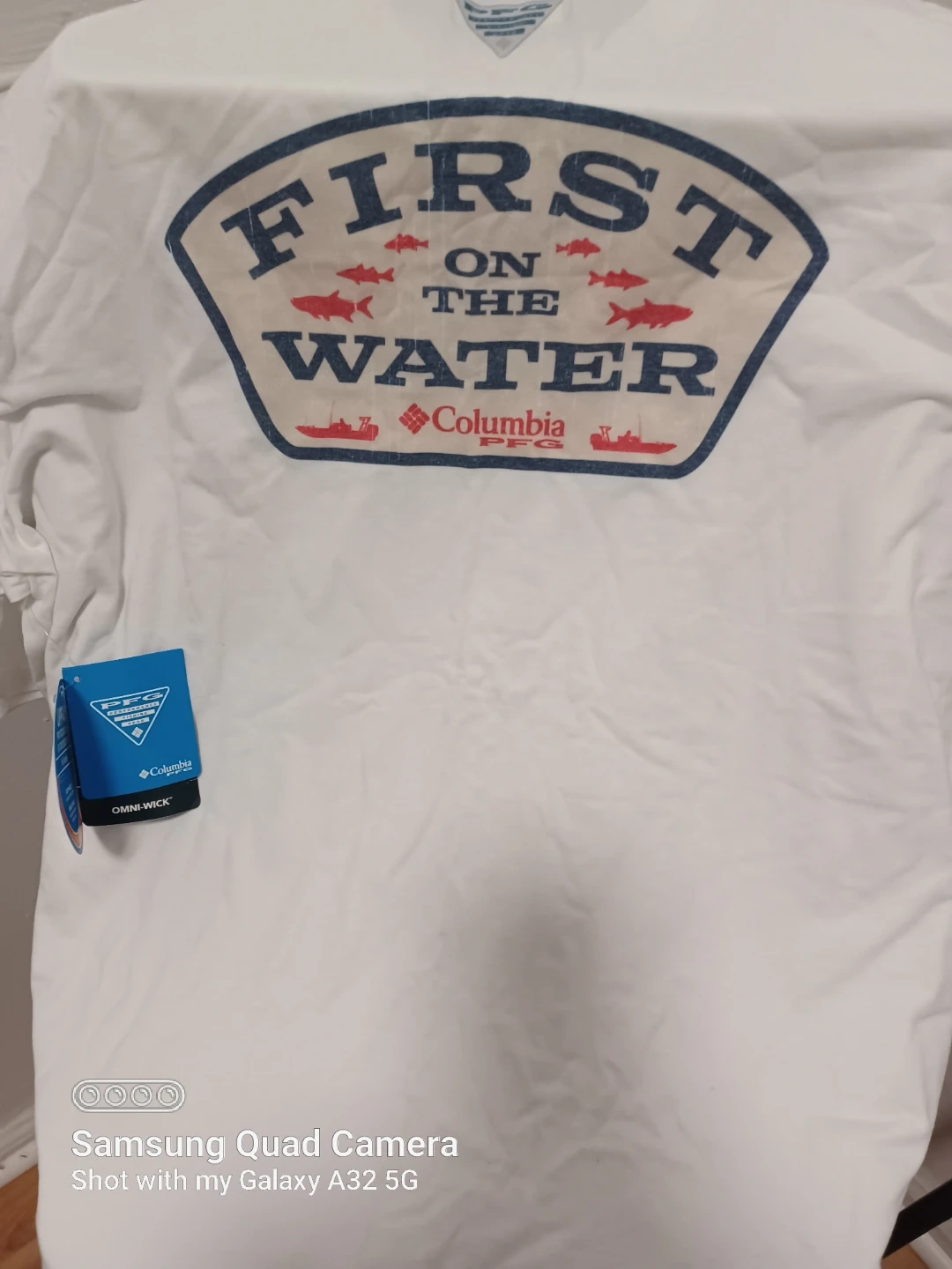 This is a Columbia long sleeve shirt in size XXL. It is white and features the "First on the Water" design on the back. It has Omni-Wick technology.xxl.. 🥕