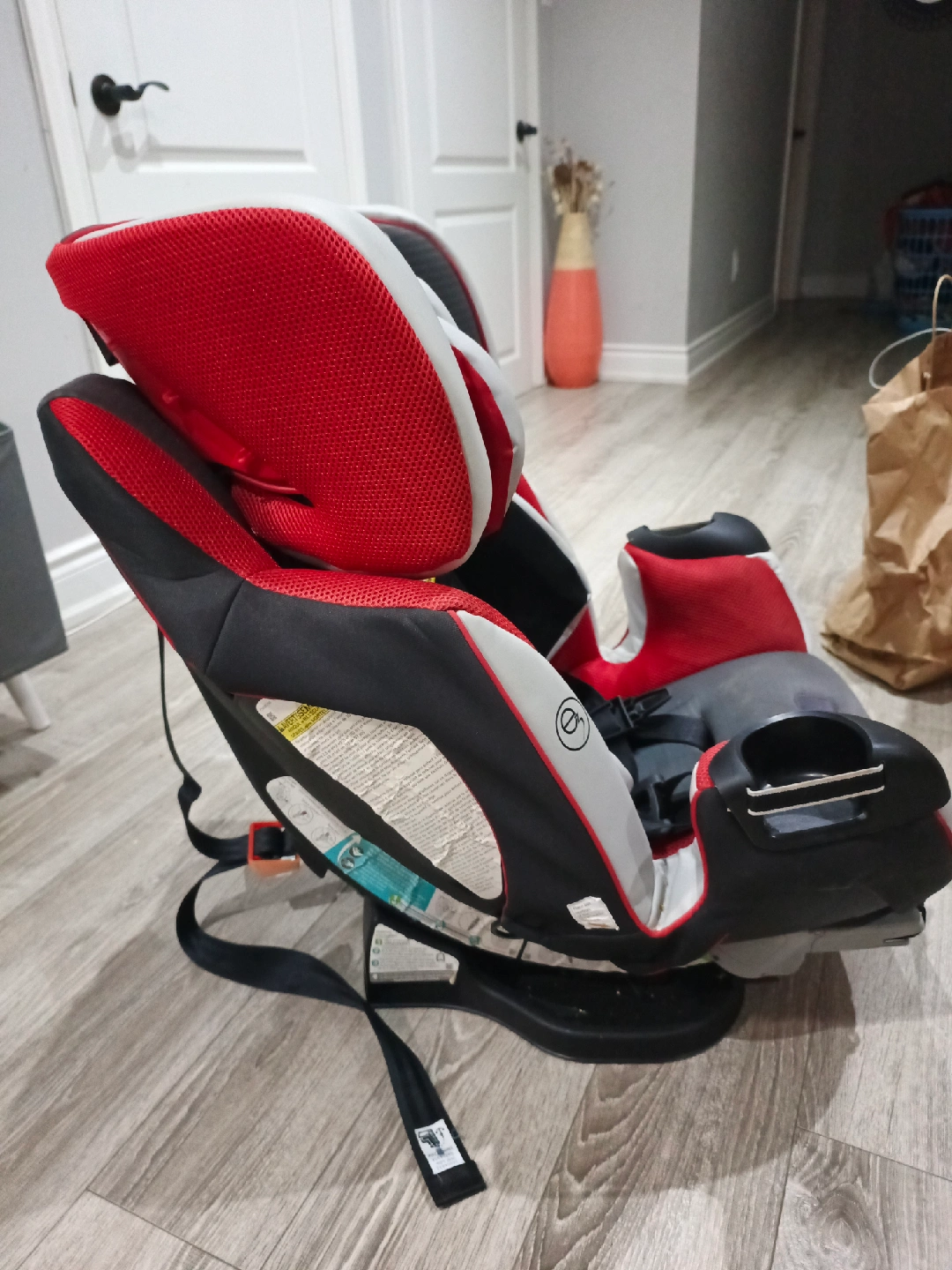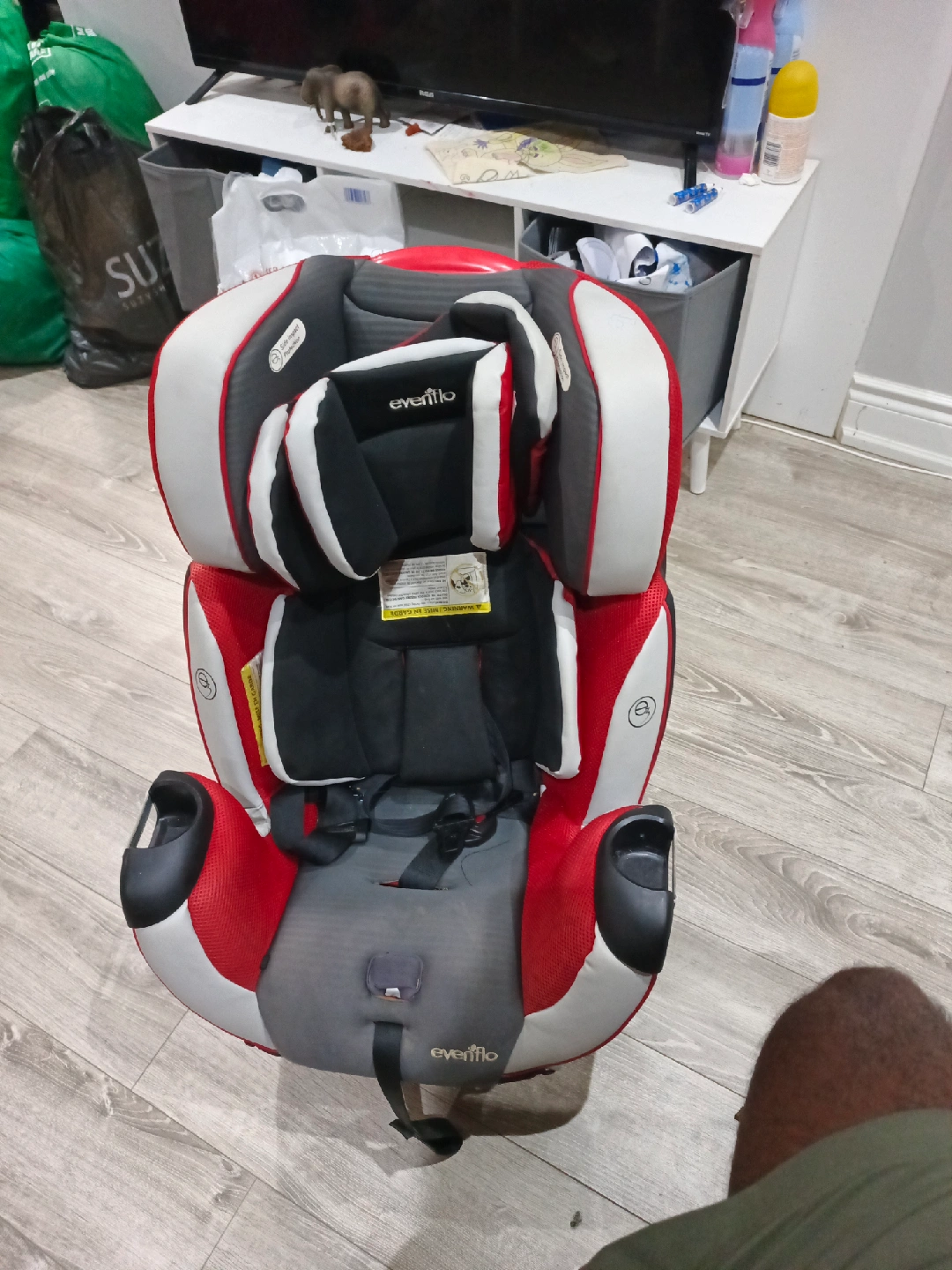 Selling a used Evenflo car seat in red, black, and grey. It's in good condition and ready for its next little passenger! Perfect for keeping your child safe and comfortable on the road