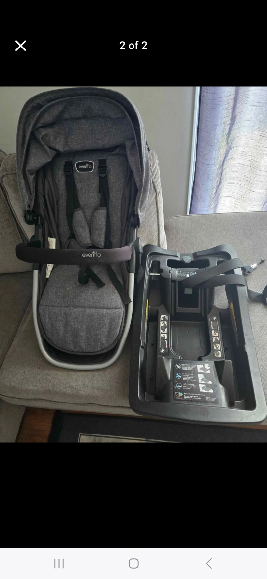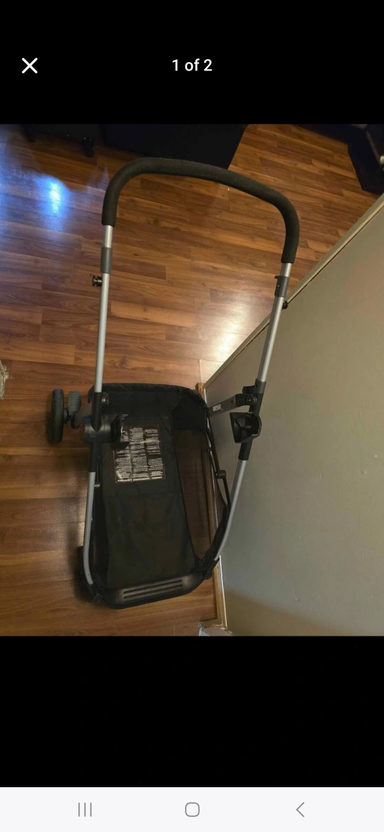 10Includes stroller, and base. Stroller has a removable basket. Gray and black.