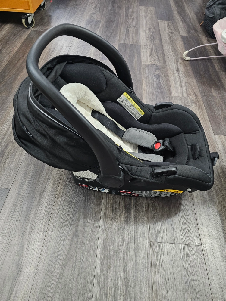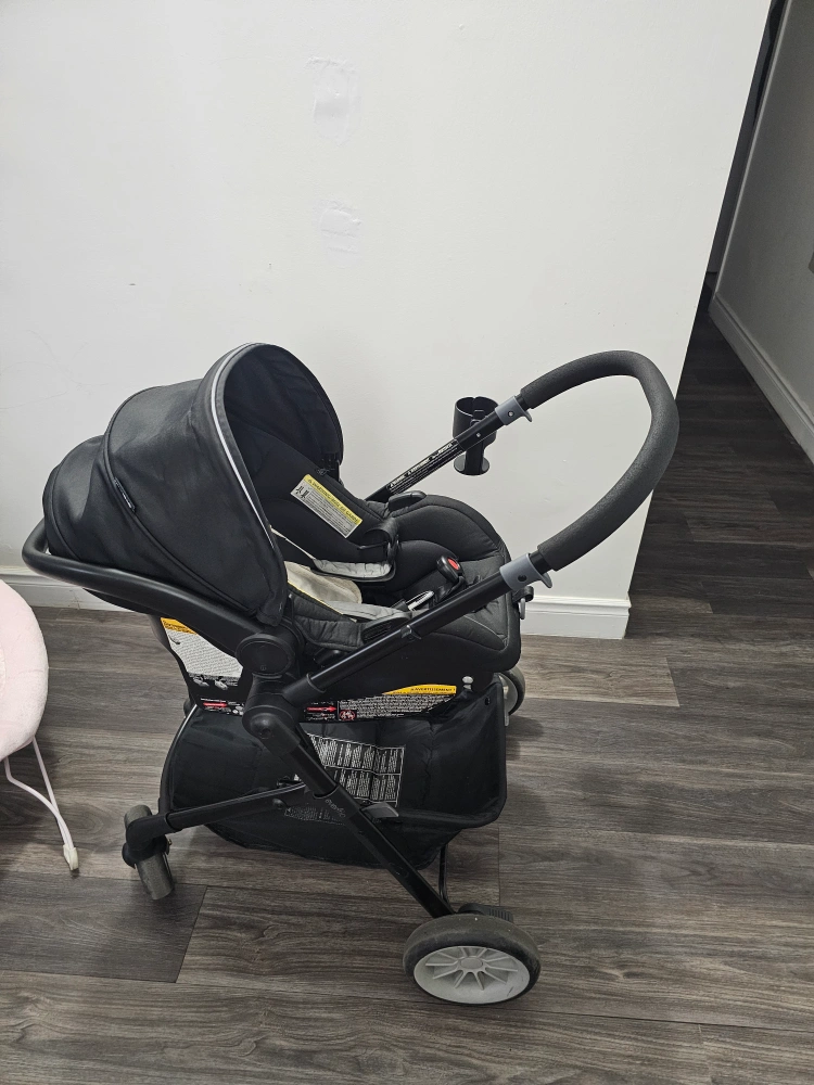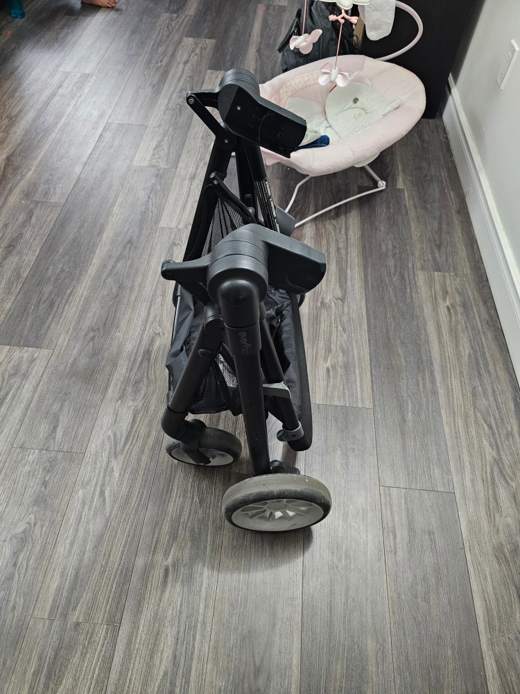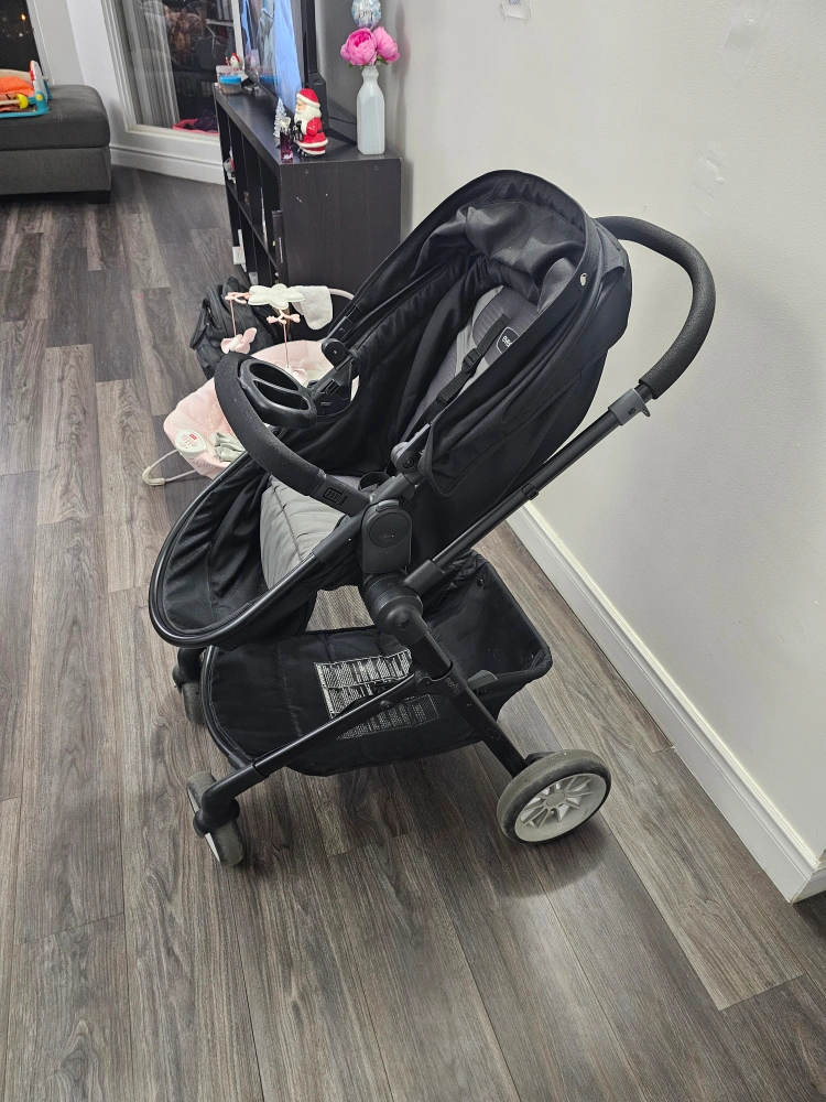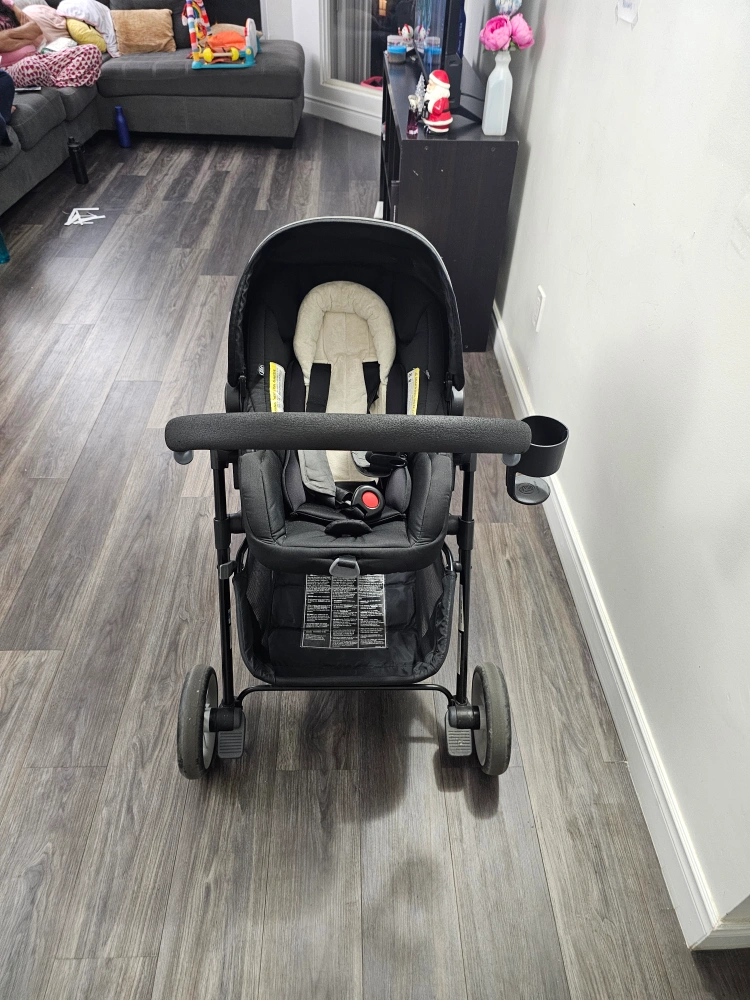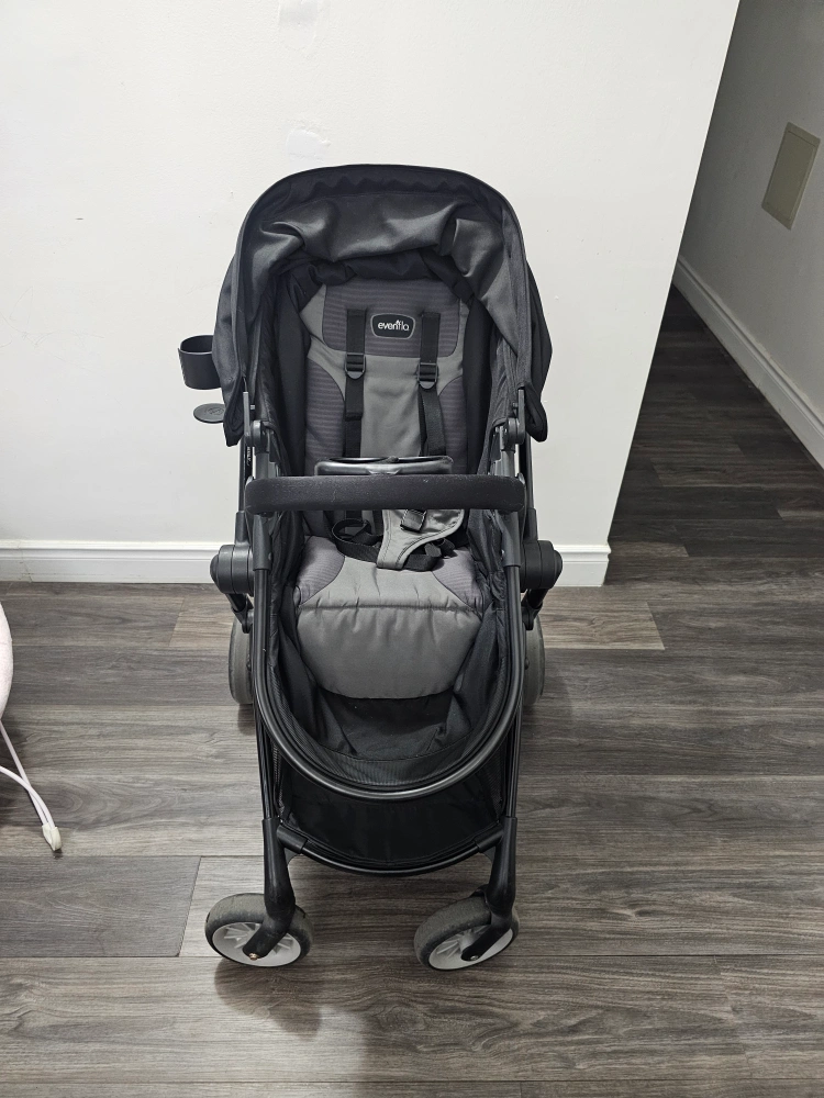 Selling an Evenflo Safemax car seat and stroller combo. It's in great condition and ready for a new family. The stroller has a convenient cup holder and a spacious storage basket underneath. Comes with foot muff and car base. Car seat expires in Nov 2026.