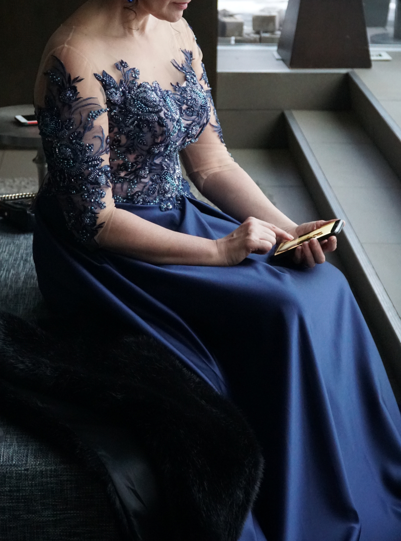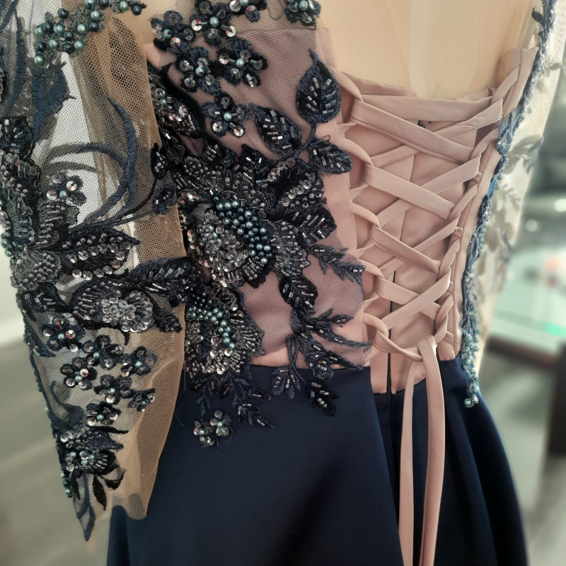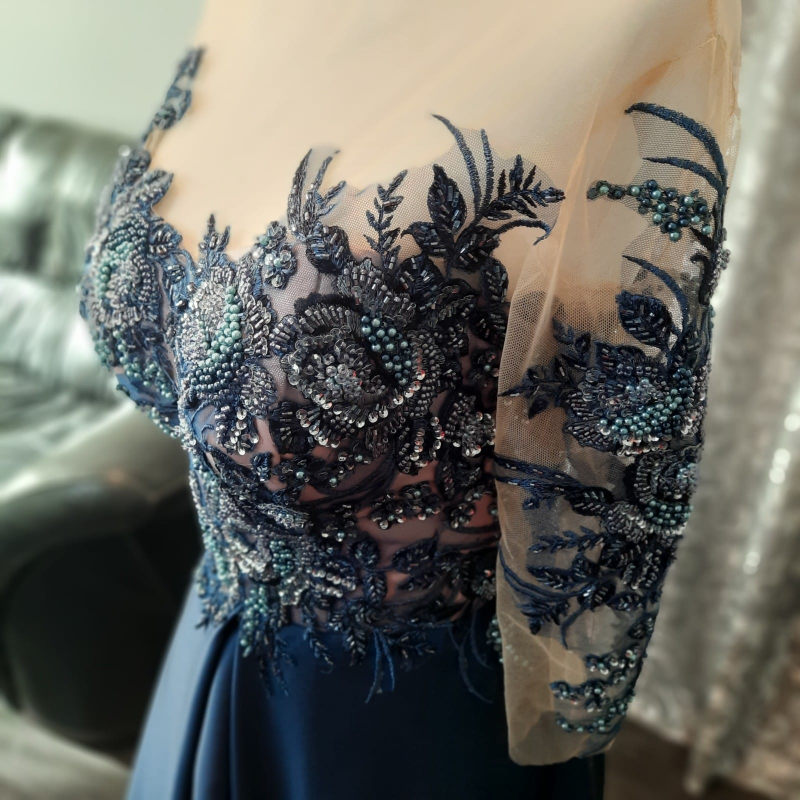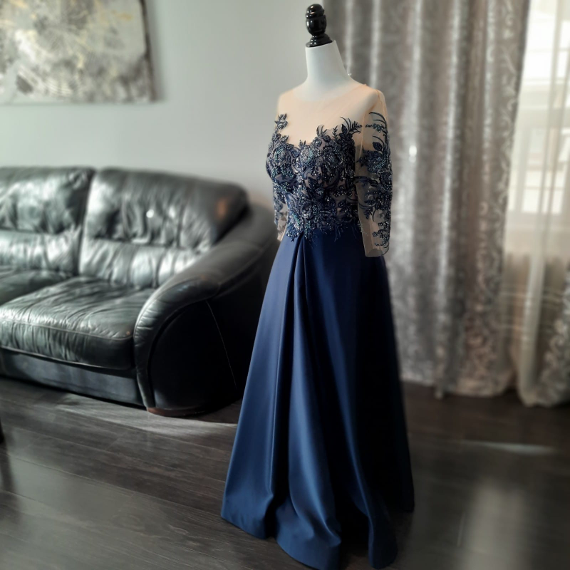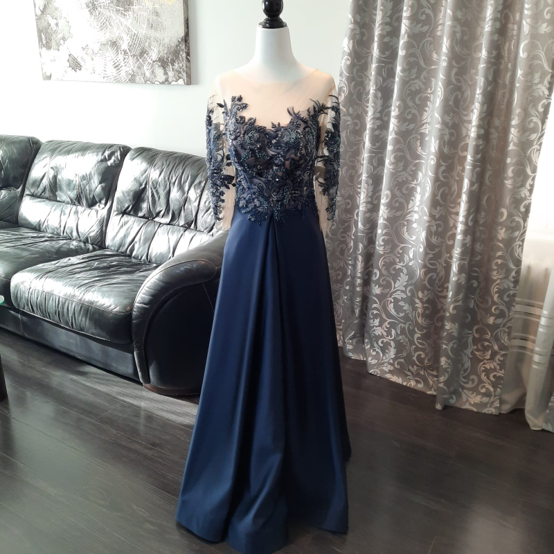 Long evening dress in dark navy blue color. Fabric: Satin. Hand embroidered with glass beads and artificial pearls. Back is adjustable. It can fit different sizes. Made in Ukraine. Handmade.