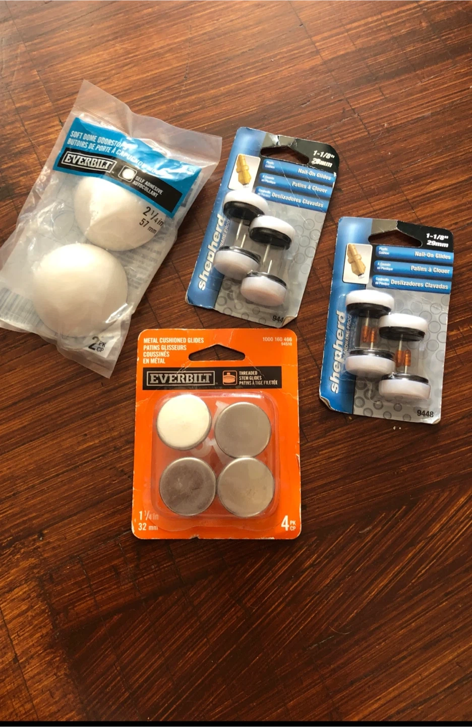 300Selling a mix of glides and doorstops from Everbilt and Shepherd. Includes: - Everbilt Soft Dome Doorstops (2 1/4 in / 57 mm, self-adhesive) - Shepherd Nail-On Glides (1-1/8" / 29mm) - Everbilt Metal Cushioned Glides (1 1/4 in / 32 mm)