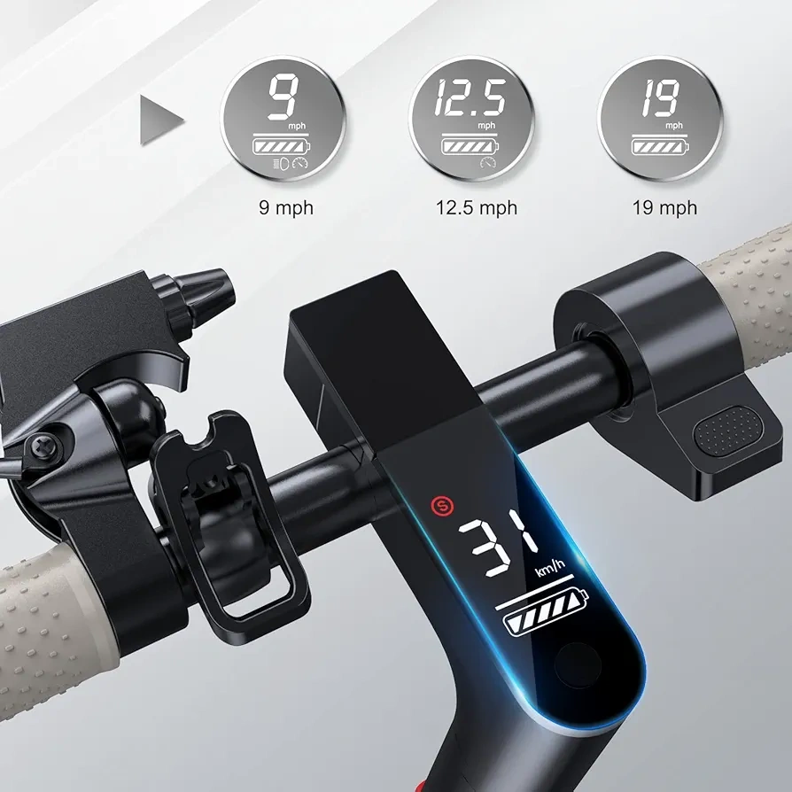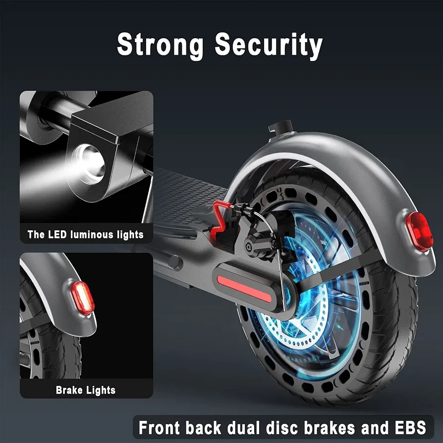 Foldable design, easy to carry. LED lights and brake lights for safety. Dual disc brakes and EBS. Maximum speed 19 mph. Weighs 13 kg. 44 inch height when unfolded. Price is already low and FIRM.