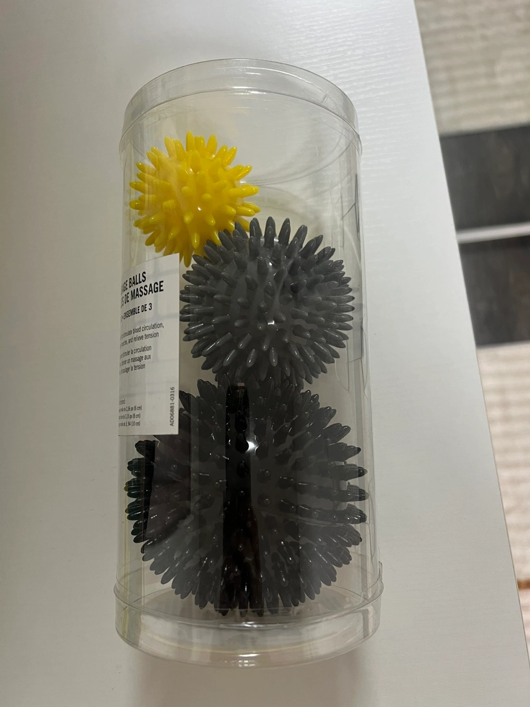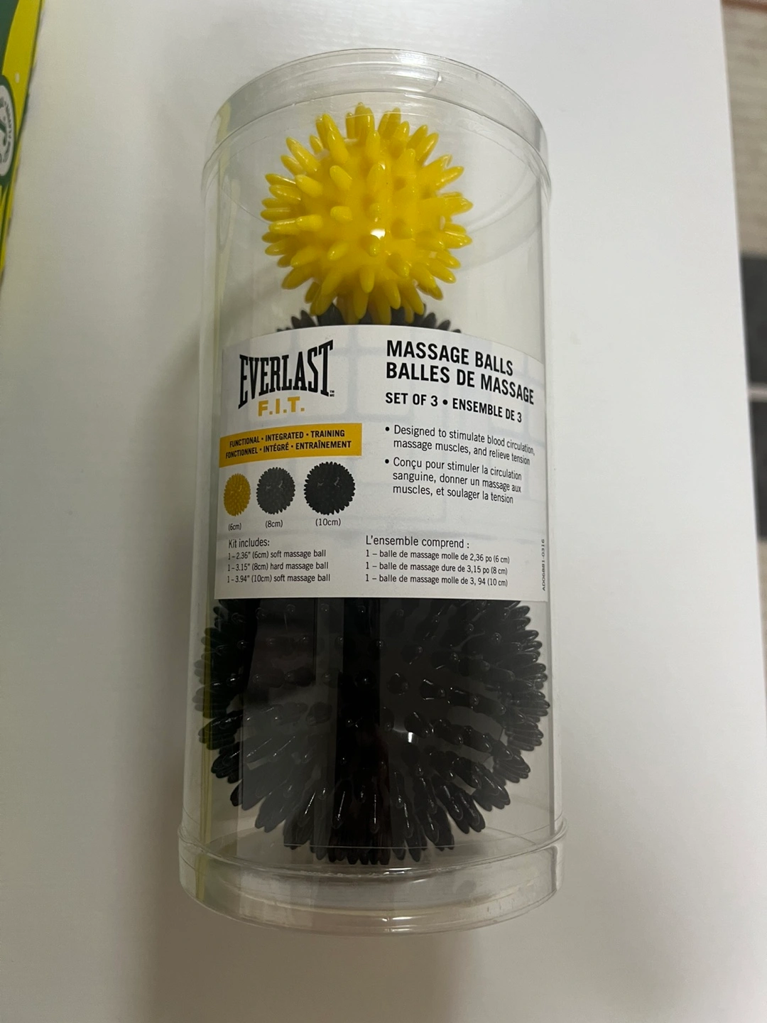 69Get ready to relieve some tension with this set of three Everlast massage balls! The set includes one 2.36" (6cm) soft massage ball, one 3.15" (8cm) hard massage ball, and one 3.94" (10cm) soft massage ball. Designed to stimulate blood circulation and relieve tension in muscles, this set is perfect for anyone looking to relax and unwind