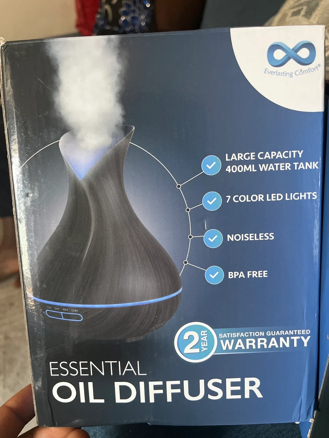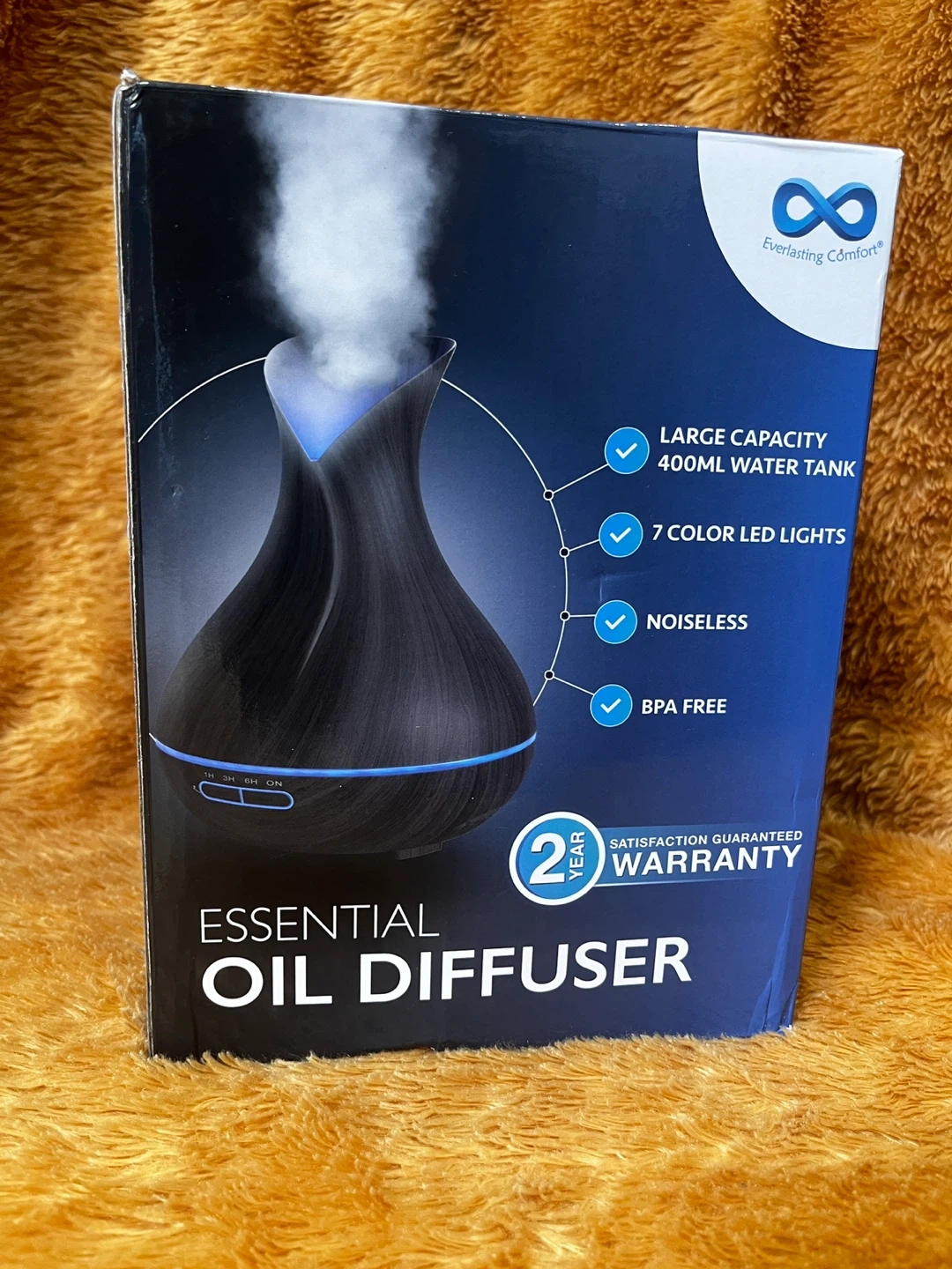 78I'm selling a brand new Everlasting Comfort Essential Oil Diffuser, still in its original box! It features: - A large capacity 400ml water tank - 7 colour LED lights - Noiseless operation - BPA free materials It also comes with a 2-year satisfaction guaranteed warranty. Easy to operate, just lift the cover, insert the power cable, add water and drops of essential oil, and press the button to turn it on!