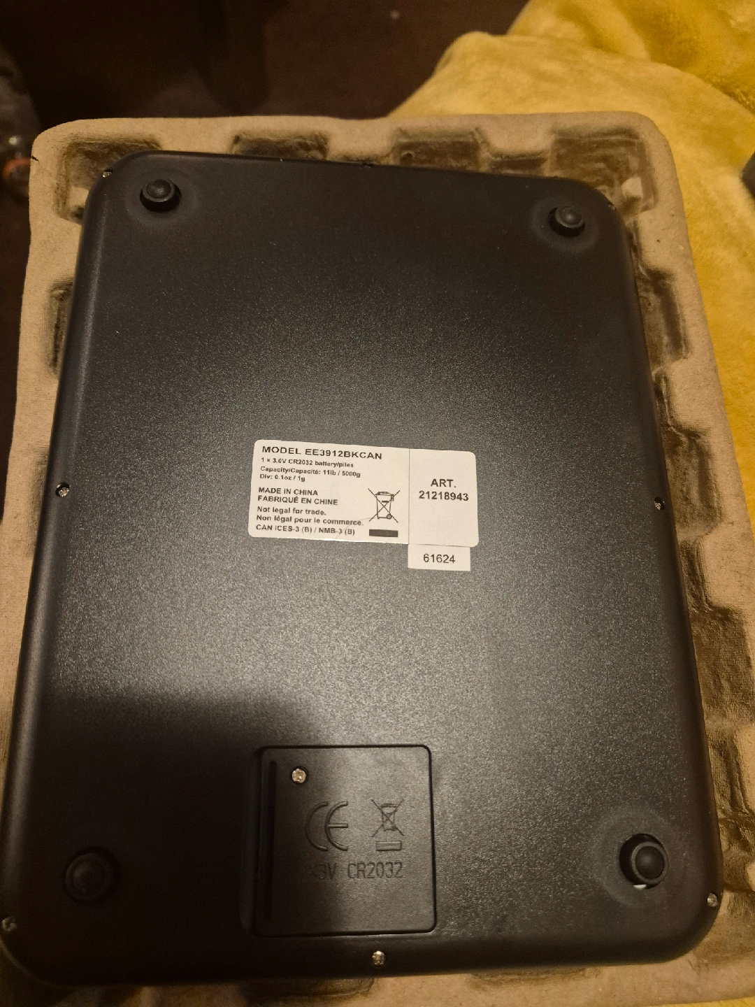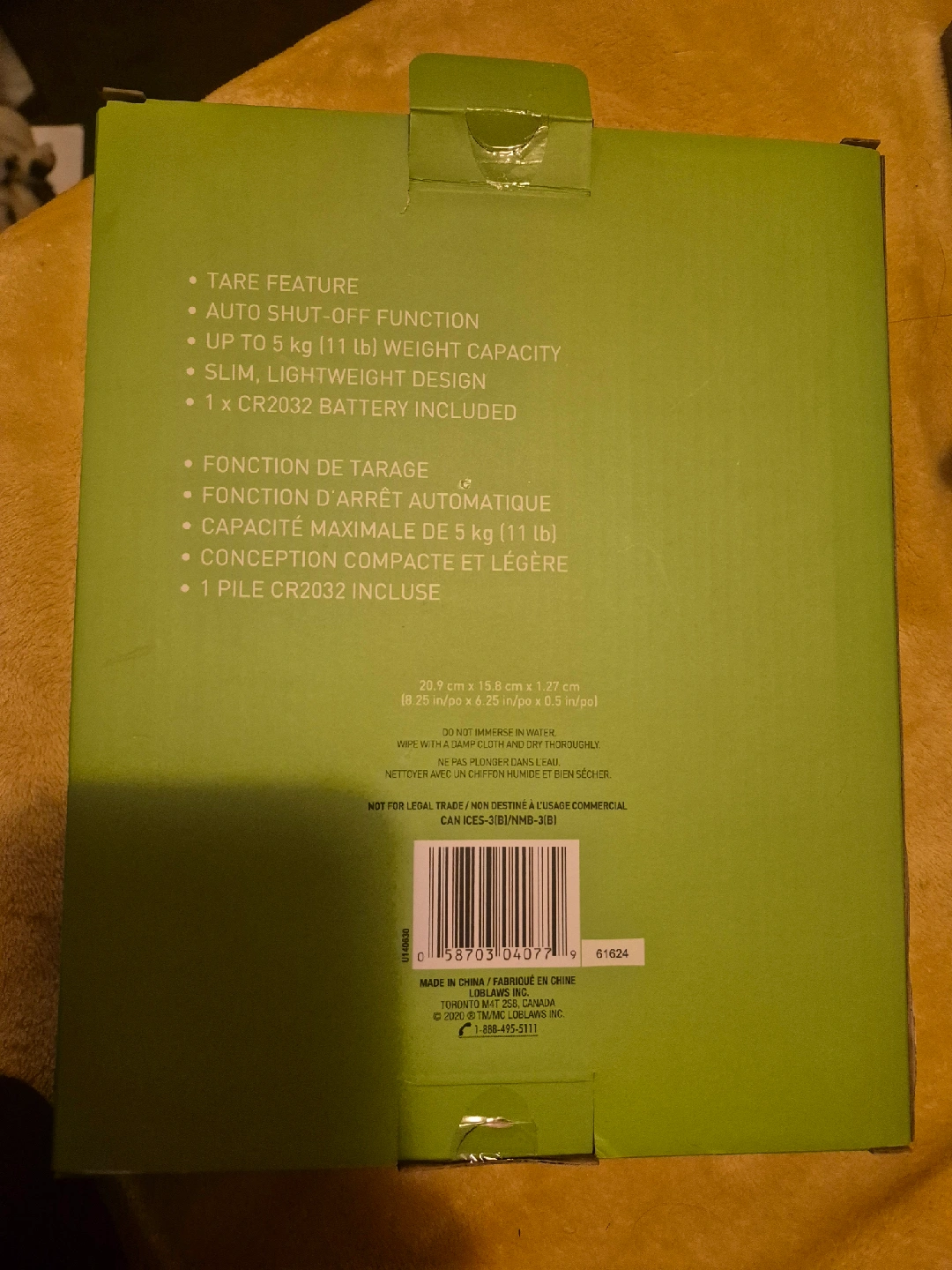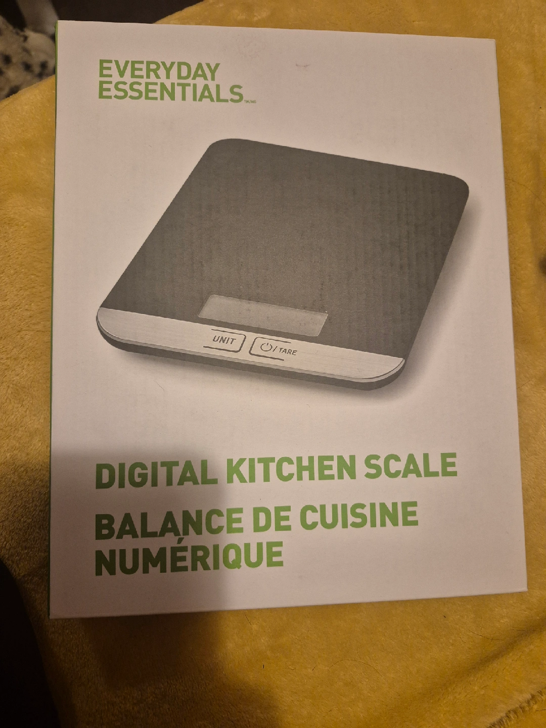 182Selling an Everyday Essentials digital kitchen scale! It has a tare feature and auto shut-off function. It can weigh up to 5 kg (11 lb). It's slim and lightweight and includes 1 x CR2032 battery. The dimensions are 20.9 cm x 15.8 cm x 1.27 cm (8.25 in/po x 6.25 in/po x 0.5 in/po)