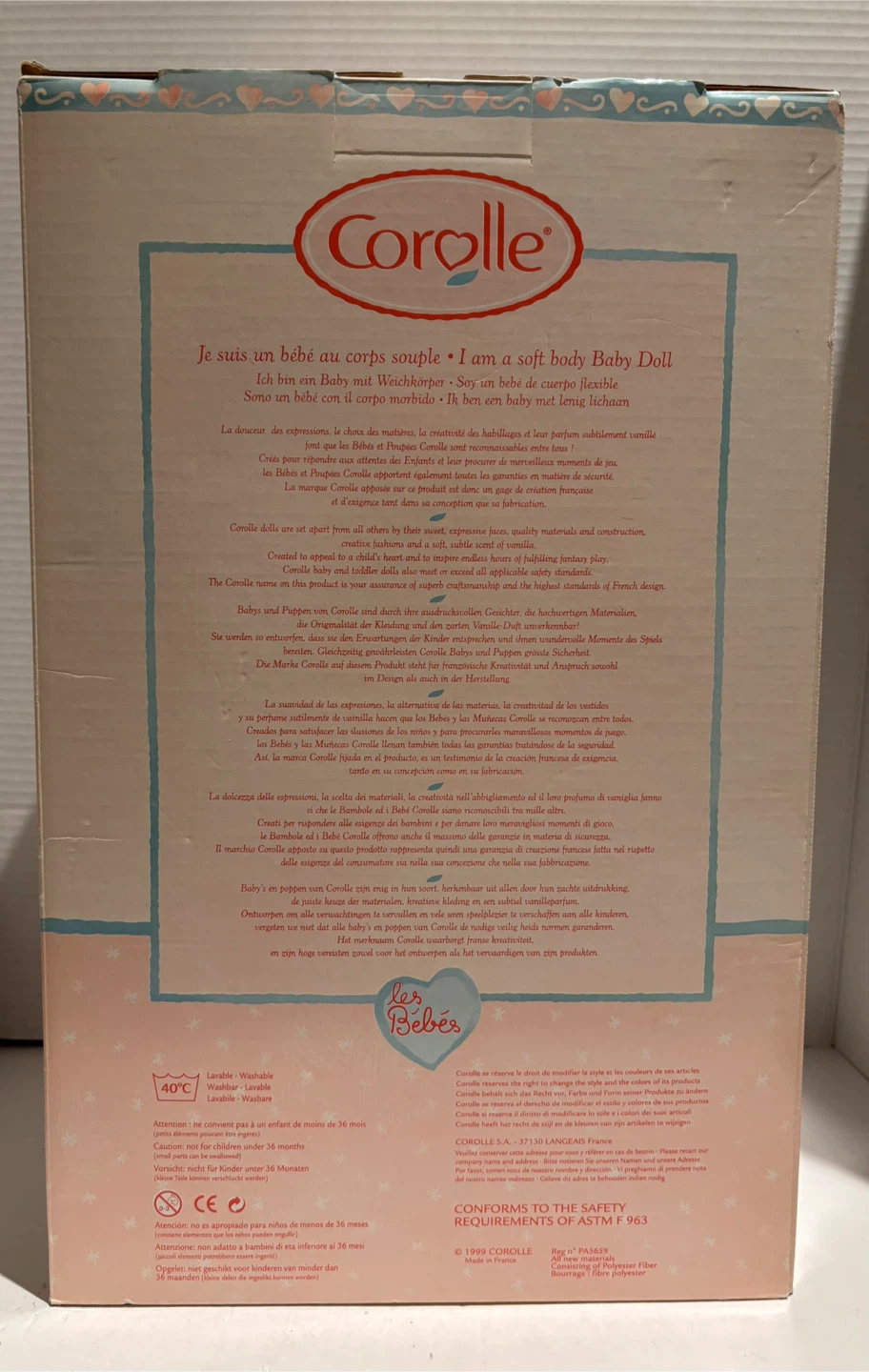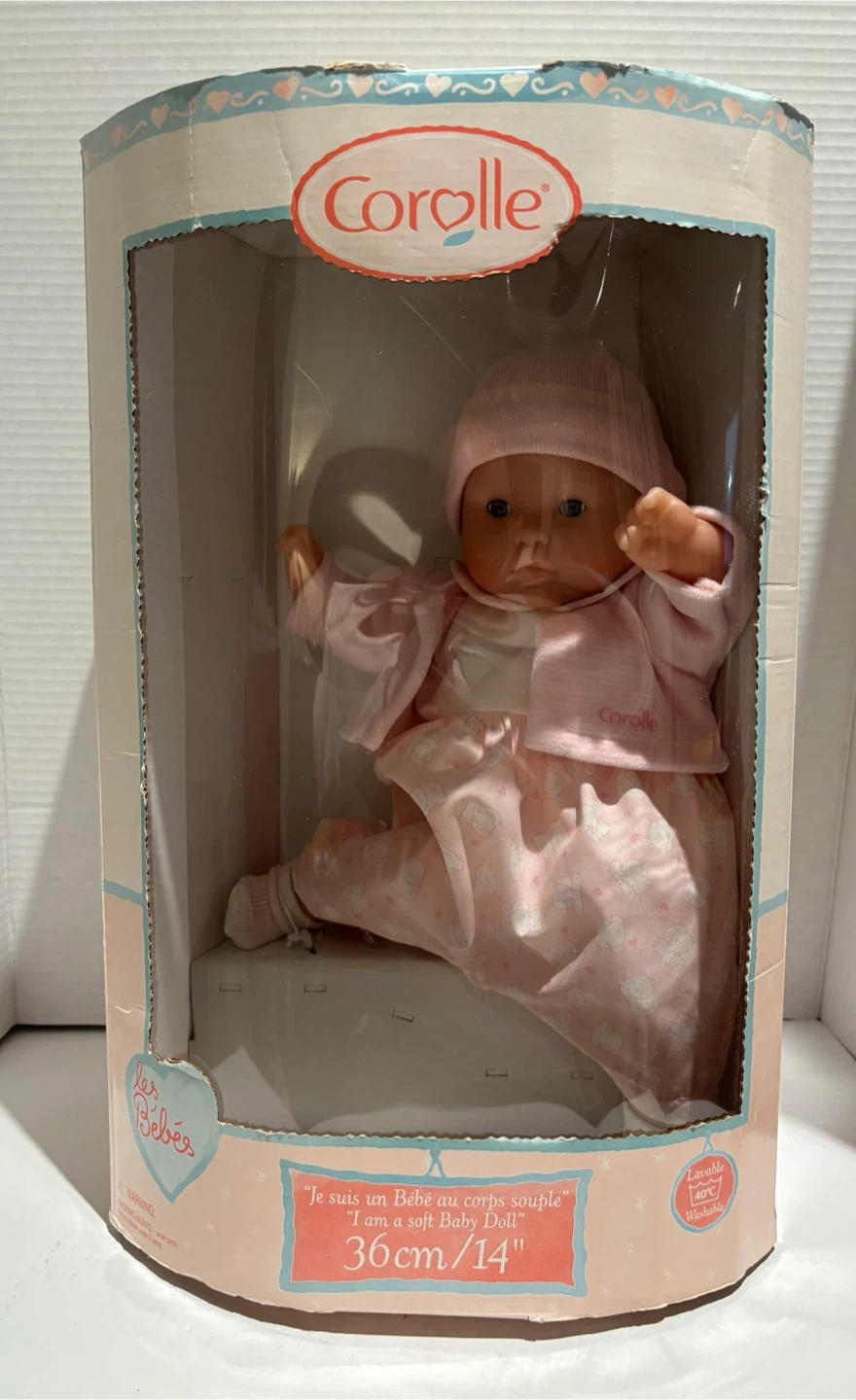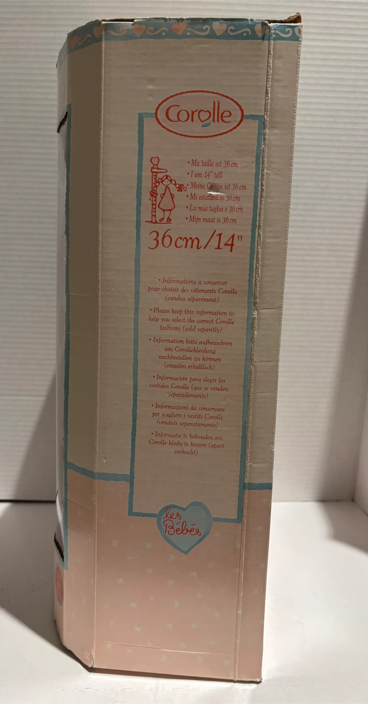 A rare and wonderful find for Corolle collectors! This is the authentic 1999 Corolle "Love Pink" baby doll from the "Les Bébés" collection. This 14-inch (36 cm) large baby doll is New in Box (NIB) and has never been removed from her original 1990s display packaging.