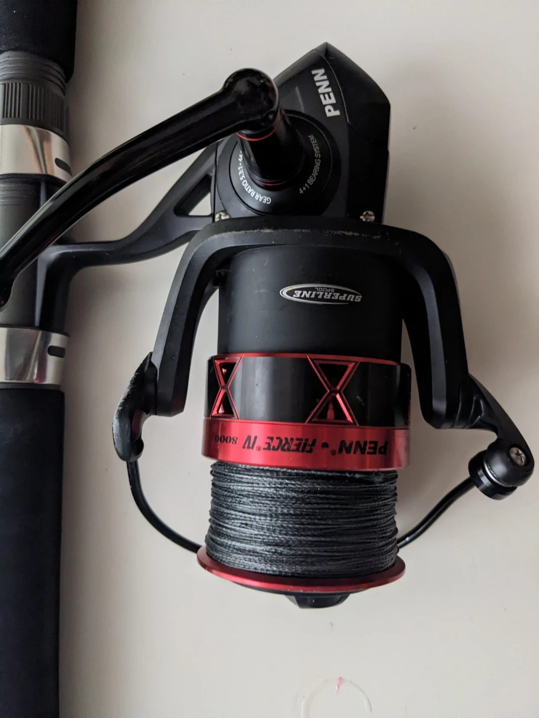 Penn Fierce IV 8000 spinning reel with 100lb braid, paired with ugly stick bigwater series 12' extra heavy surf rod. Reel spins well, perfect for sturgeon fishing! Bought for $550 asking 400. Only fished a couple times.