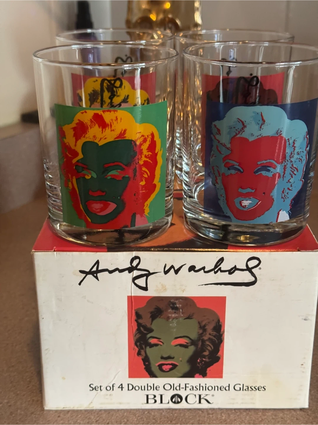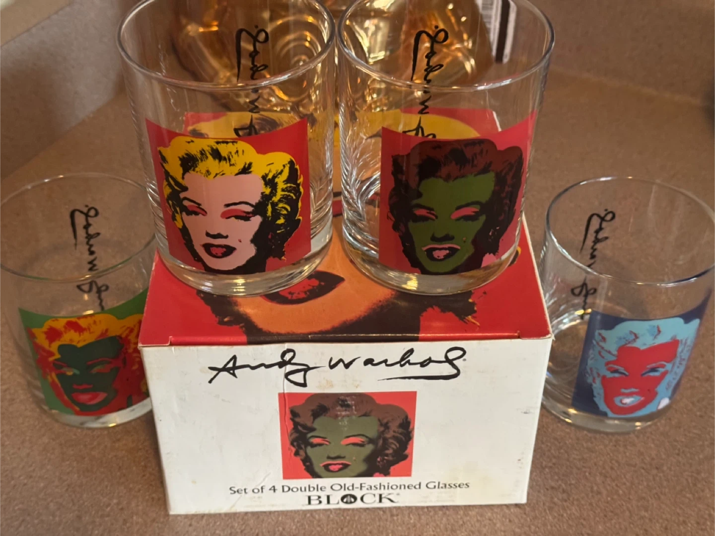 Selling a set of 4 Andy Warhol old-fashioned glasses! The glasses feature different iconic Marilyn Monroe prints. The set comes in its original box, making it a great addition to any collection or a unique gift. Over 20 years old. Used once. One owner. E-transfer only Thank you.