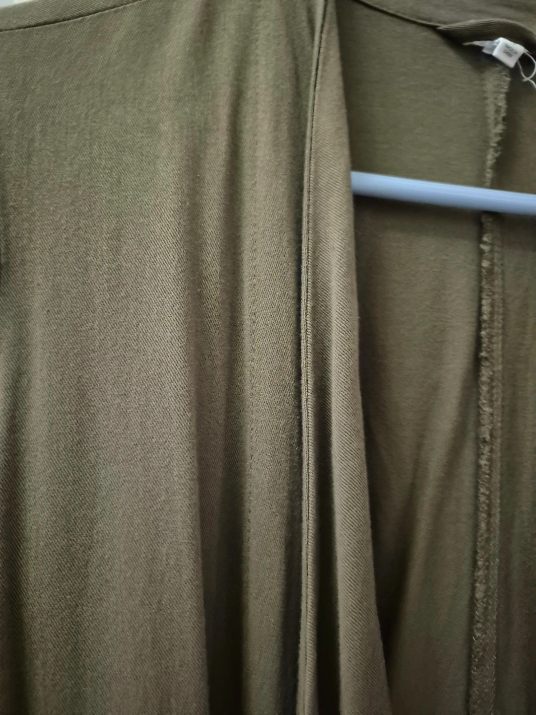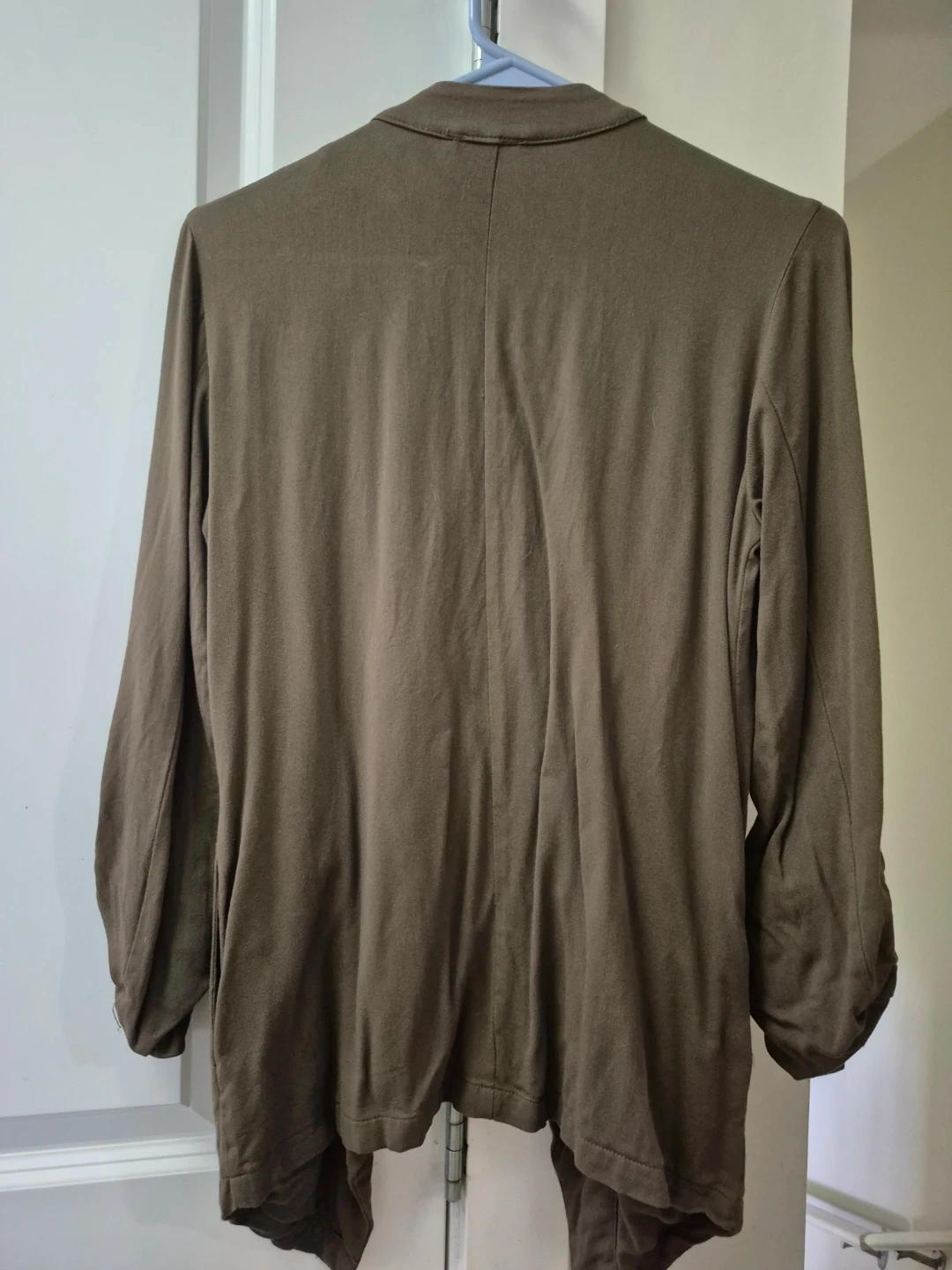 Olive green, open-front cardigan with roll-tab sleeves. This lightweight layering piece is great for adding a touch of style to any outfit. It has been gently worn, asking $4. Pick-up location 333 Taralake Way NE.
