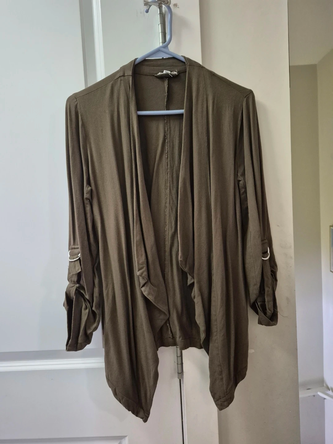 Olive green, open-front cardigan with roll-tab sleeves. This lightweight layering piece is great for adding a touch of style to any outfit. It has been gently worn, asking $4. Pick-up location 333 Taralake Way NE.