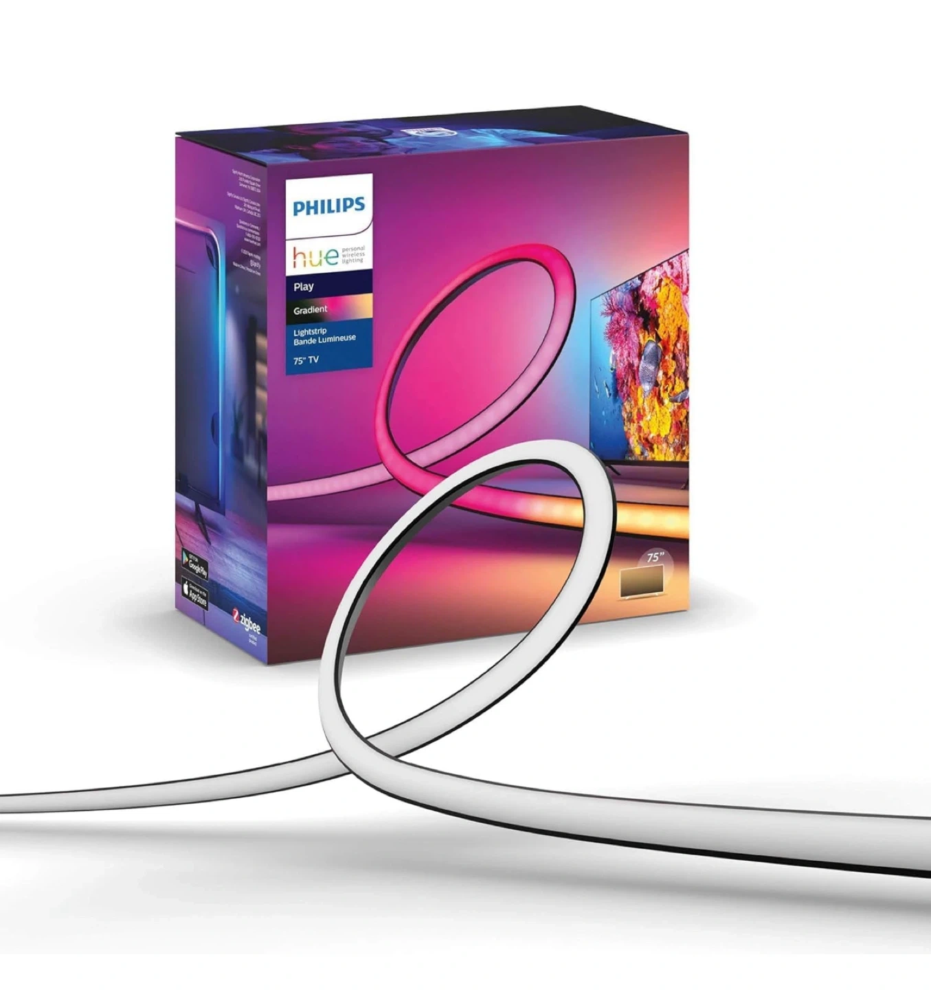 Selling a used new Philips Hue Play Gradient Lightstrip for a 75" TV! It's still in the box and comes with all the original components. This lightstrip adds a beautiful ambient glow to your TV, enhancing your viewing experience with dynamic, colourful lighting. It's easy to set up and sync with your Philips Hue system