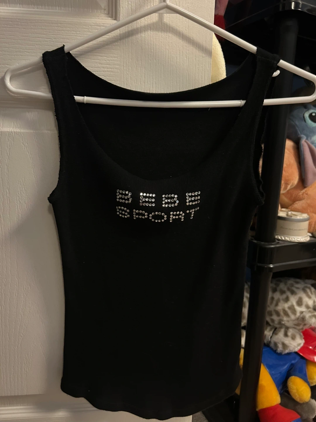 Black Bebe Sport tank top with rhinestone embellishments. It's sleeveless with a scoop neck. Material appears to be a stretchy knit.