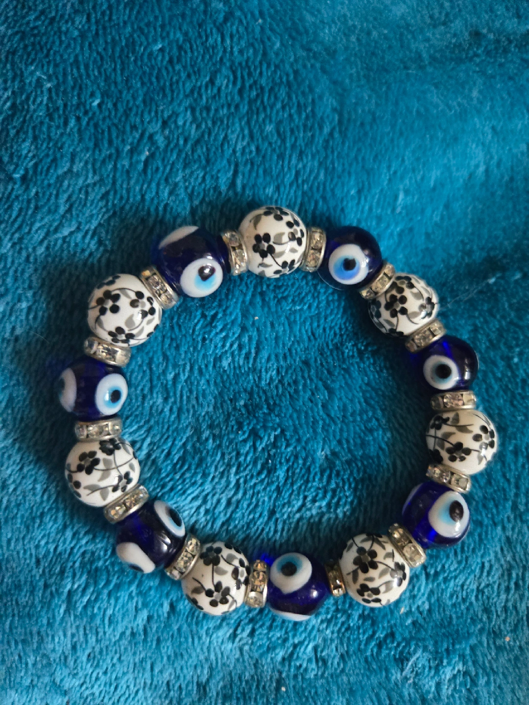 65Cute beaded bracelet with evil eye and floral design beads. Perfect for adding a touch of style to any outfit!