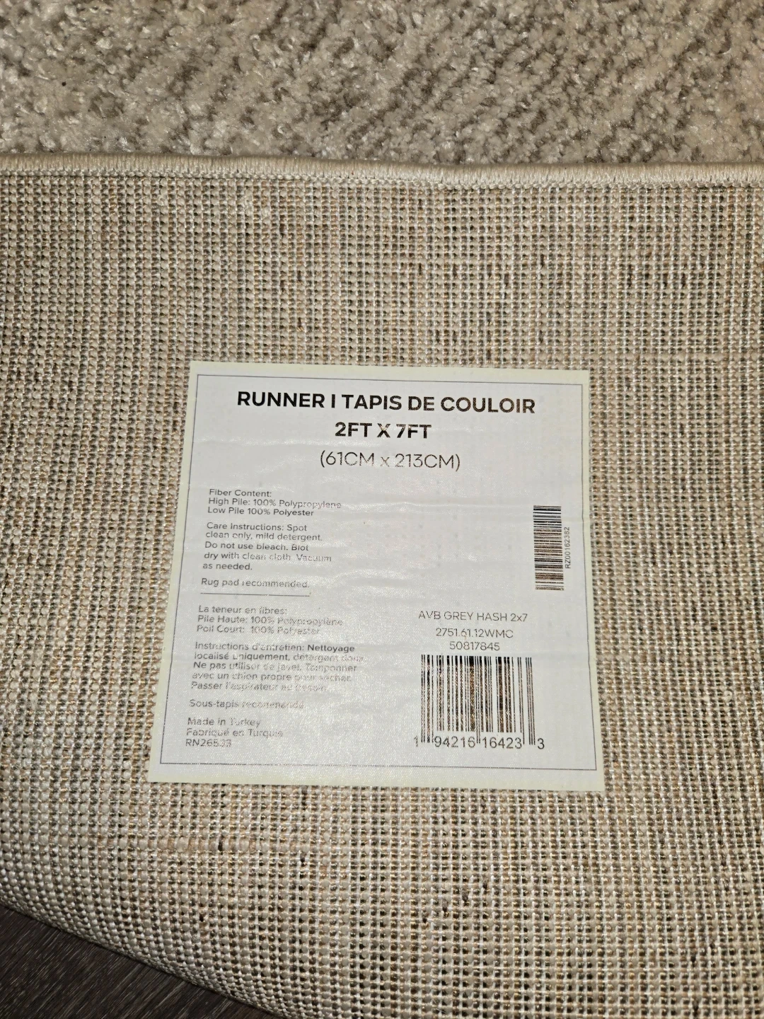 Runner carpet measuring 2ft x 7ft. Made with 100% Polypropylene high pile and 100% Polyester low pile. Spot clean only with mild detergent. Rug pad recommended.