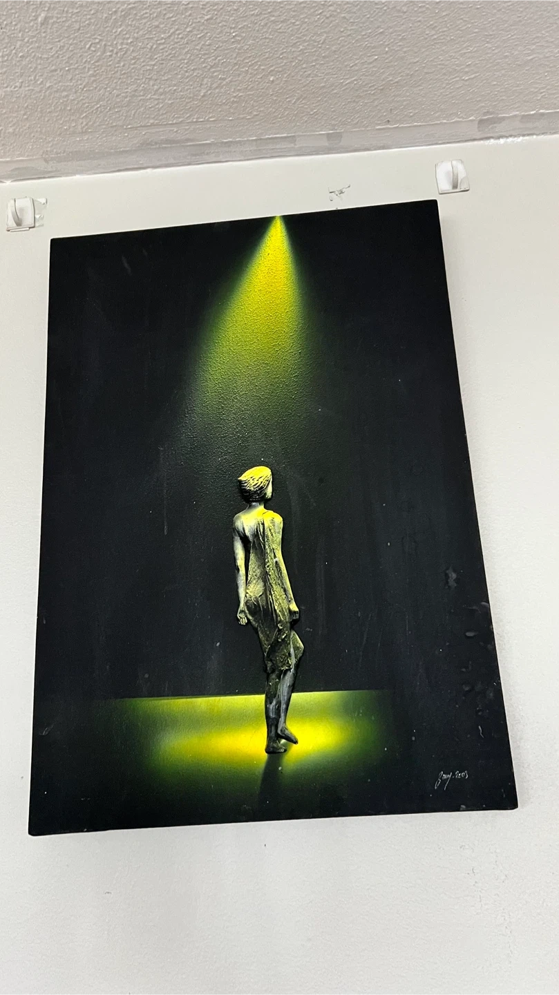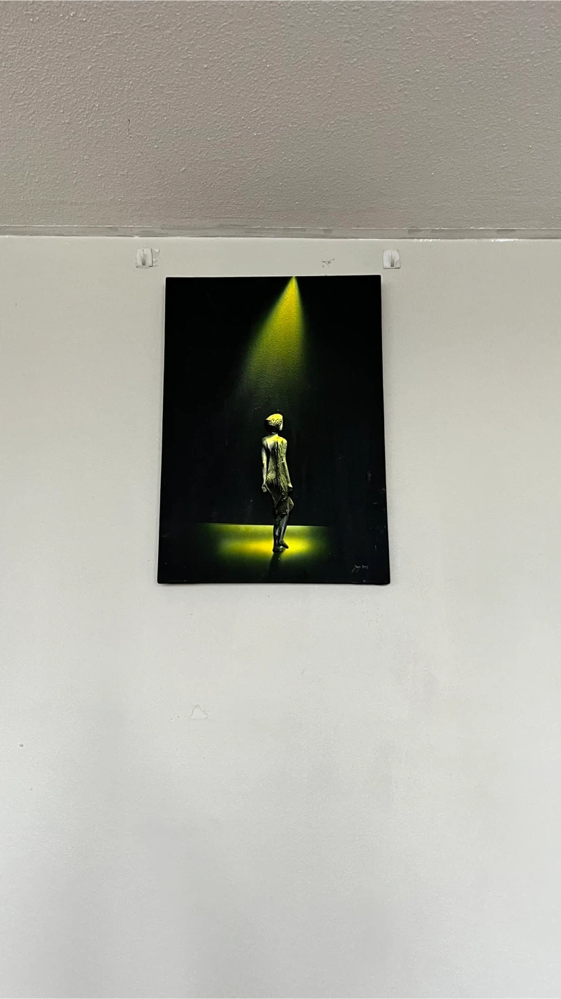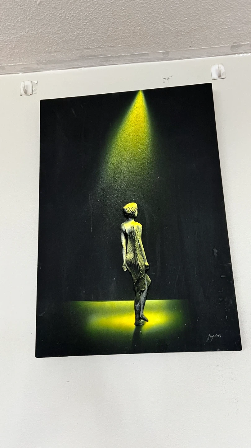 This is a piece of artwork featuring a solitary figure illuminated by a bright spotlight against a dark background. The yellow light creates a dramatic effect on the subject. The signature "Joey 2003" is visible on the bottom right. It's a unique decorative item for any space!
