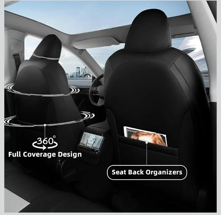 These car seat covers feature a contoured fit with foam padding for comfort. They're designed with a concealed airbag opening and a multi-layer sponge composite. The seat back organizers offer extra storage space.