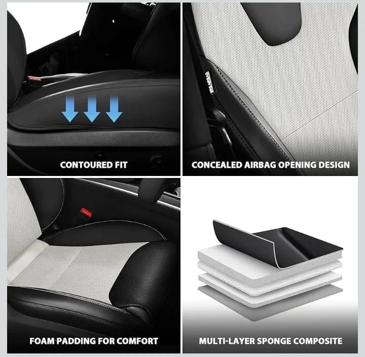 These car seat covers feature a contoured fit with foam padding for comfort. They're designed with a concealed airbag opening and a multi-layer sponge composite. The seat back organizers offer extra storage space.