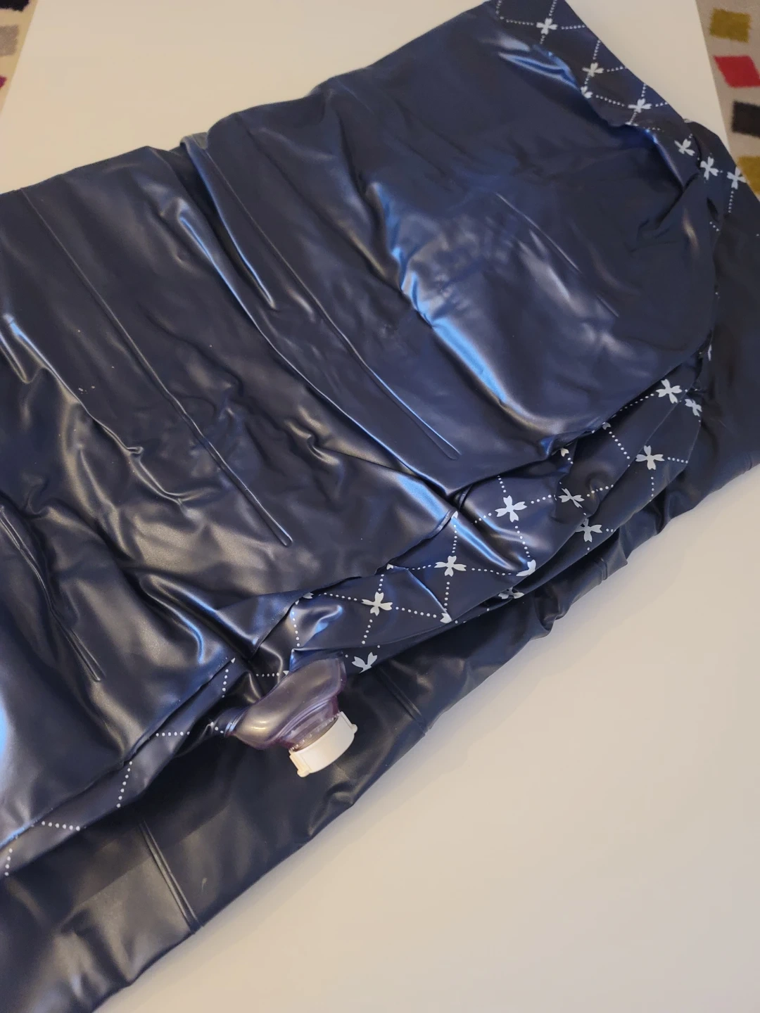 Navy blue inflatable air mattress. Features a subtle criss-cross pattern along the edges. Easy to inflate and deflate for convenient storage. Perfect for camping trips or overnight guests!