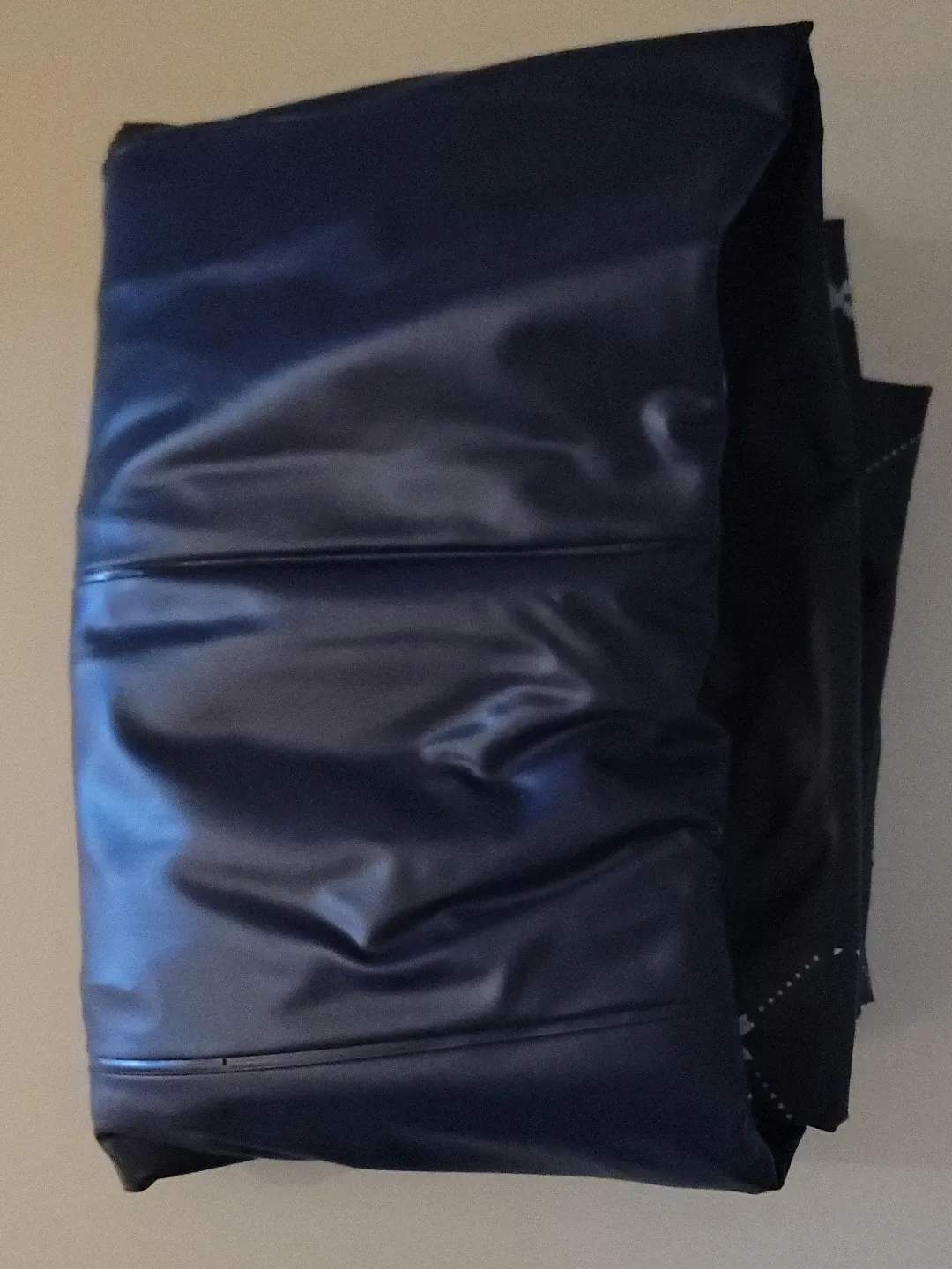Navy blue inflatable air mattress. Features a subtle criss-cross pattern along the edges. Easy to inflate and deflate for convenient storage. Perfect for camping trips or overnight guests!