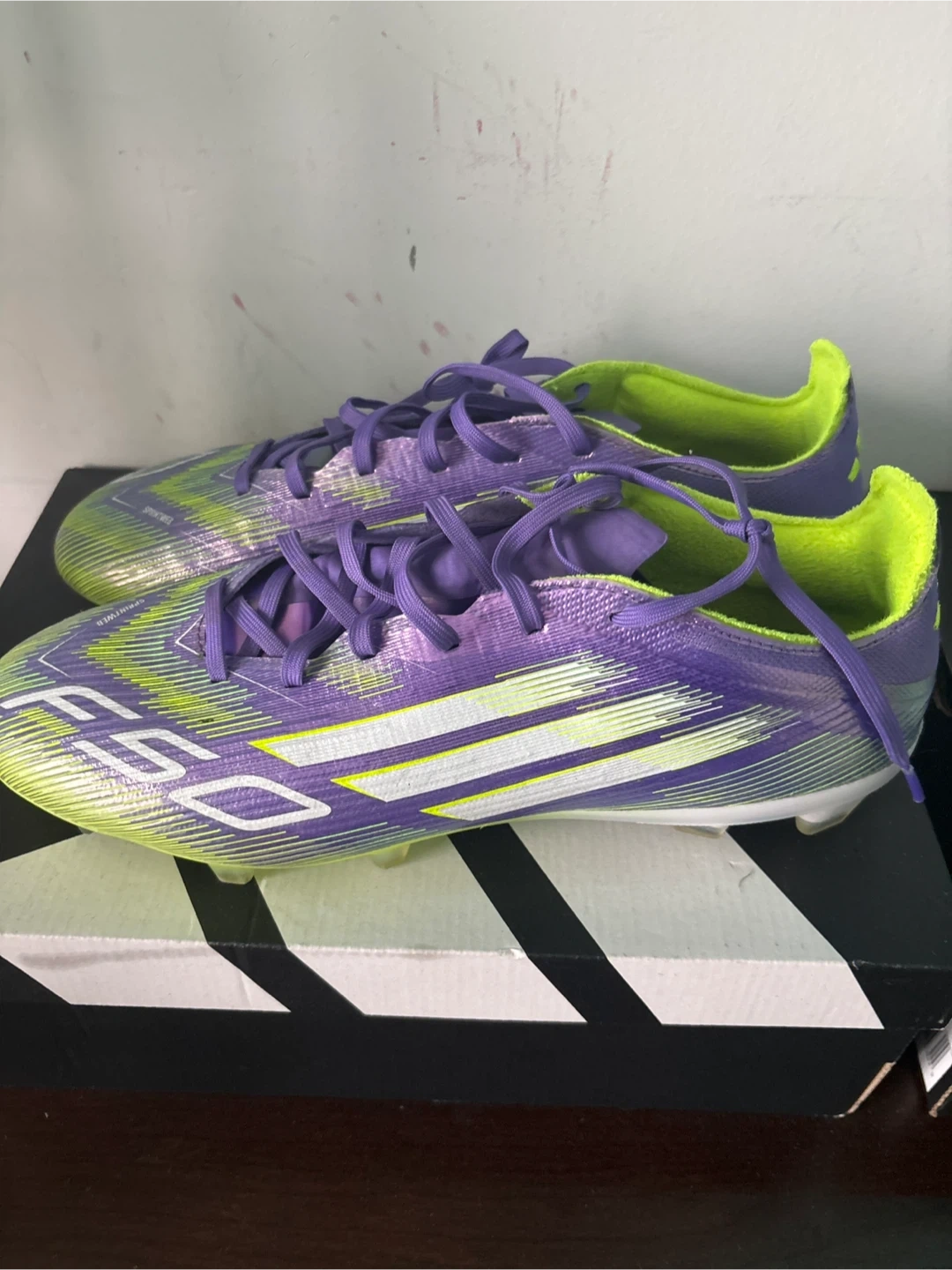 These Adidas F50 football cleats feature a vibrant purple and neon green design. They're built for performance on the field. Comes with original box.size 10