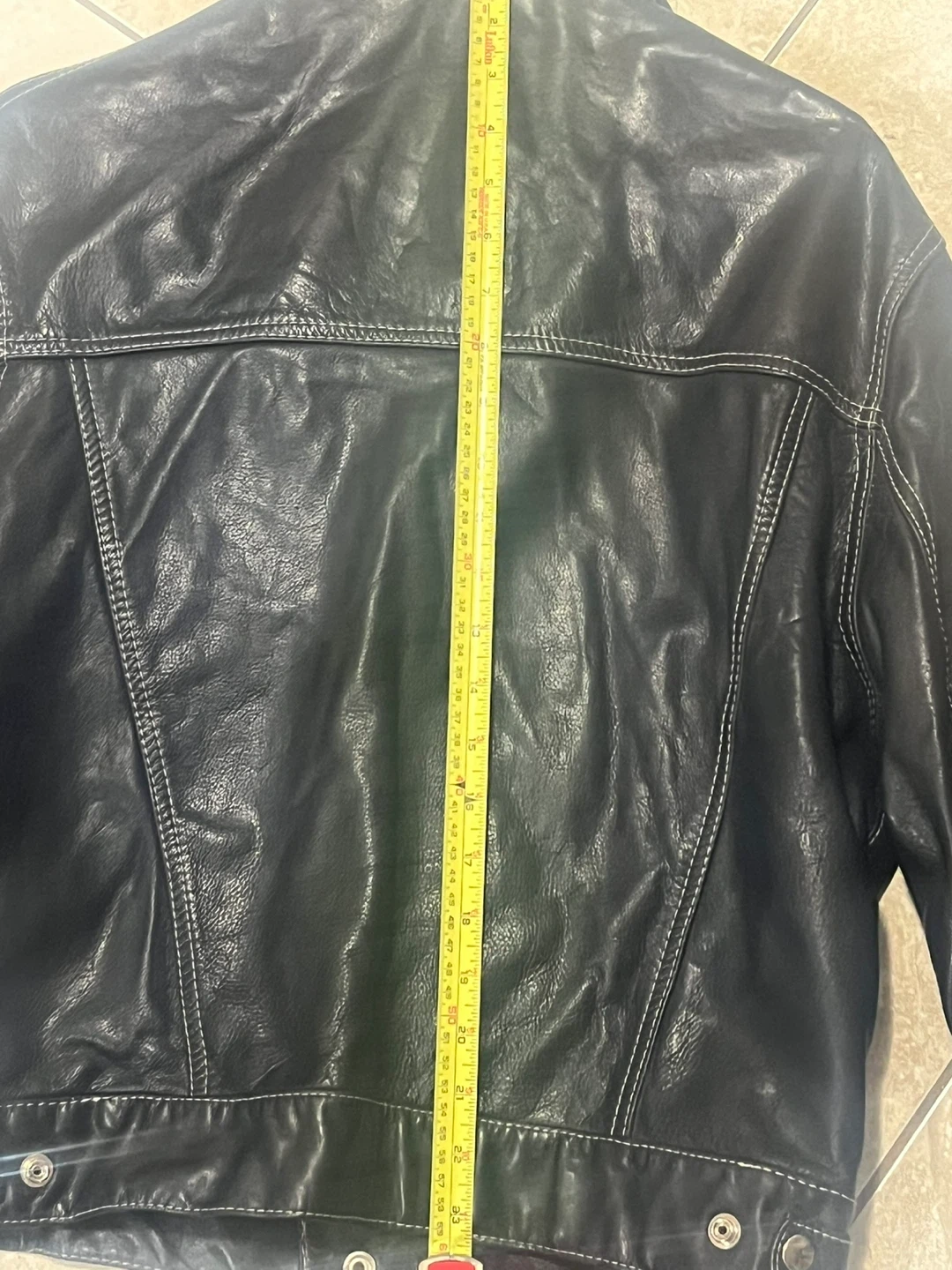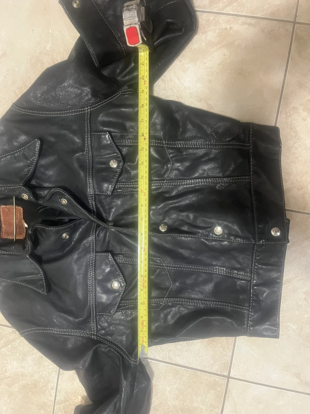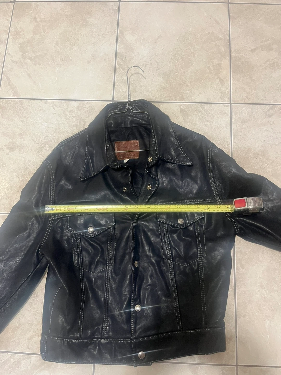 This is a leather coat , especially made in 1992 .The same design as a 502 Levi’s Jean jacket .Size small . Was custom made by a place Leather town in Toronto .This is one of a kind . This jacket is 34 years old . Mint condition, no tears .This jacket cost $700 to make in 1992 . Asking $450 or best reasonable offer