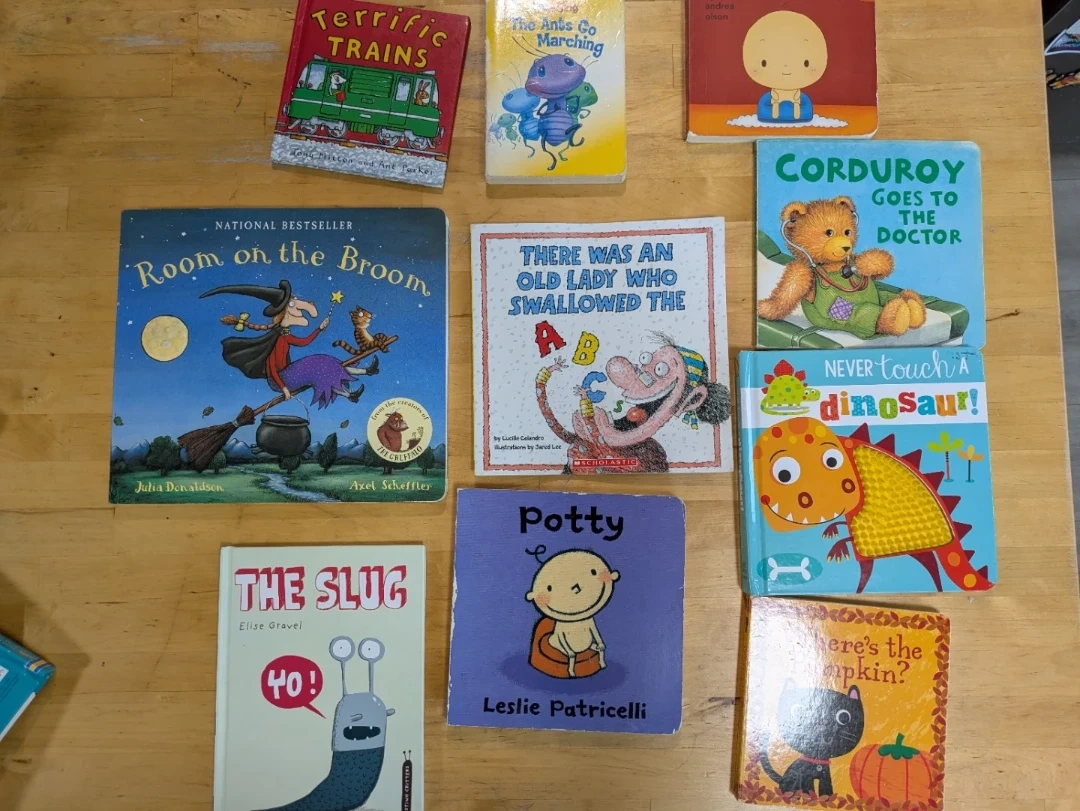 A collection of sturdy board books for young readers. Includes titles like 'Corduroy Goes to the Doctor', 'Never Touch a Dinosaur', and "Room on the Broom. Board books are durable for little hands and excellent for early literacy development.