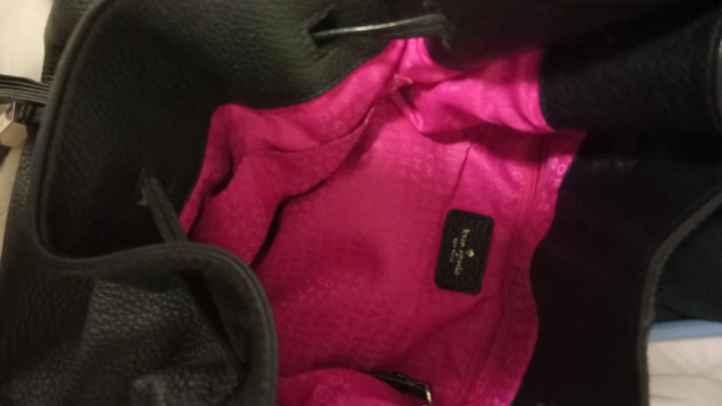 This is a pre-owned Kate Spade New York shoulder bag. It's made from black pebbled leather with a contrasting bright pink interior lining. The bag features a drawstring closure and tassel details.