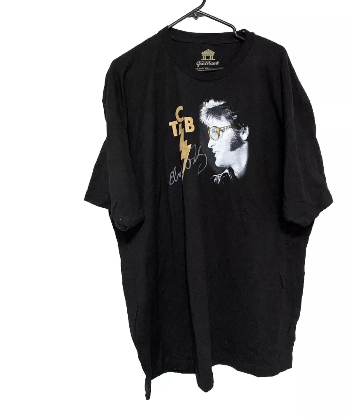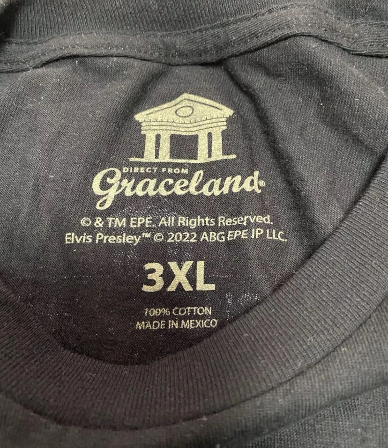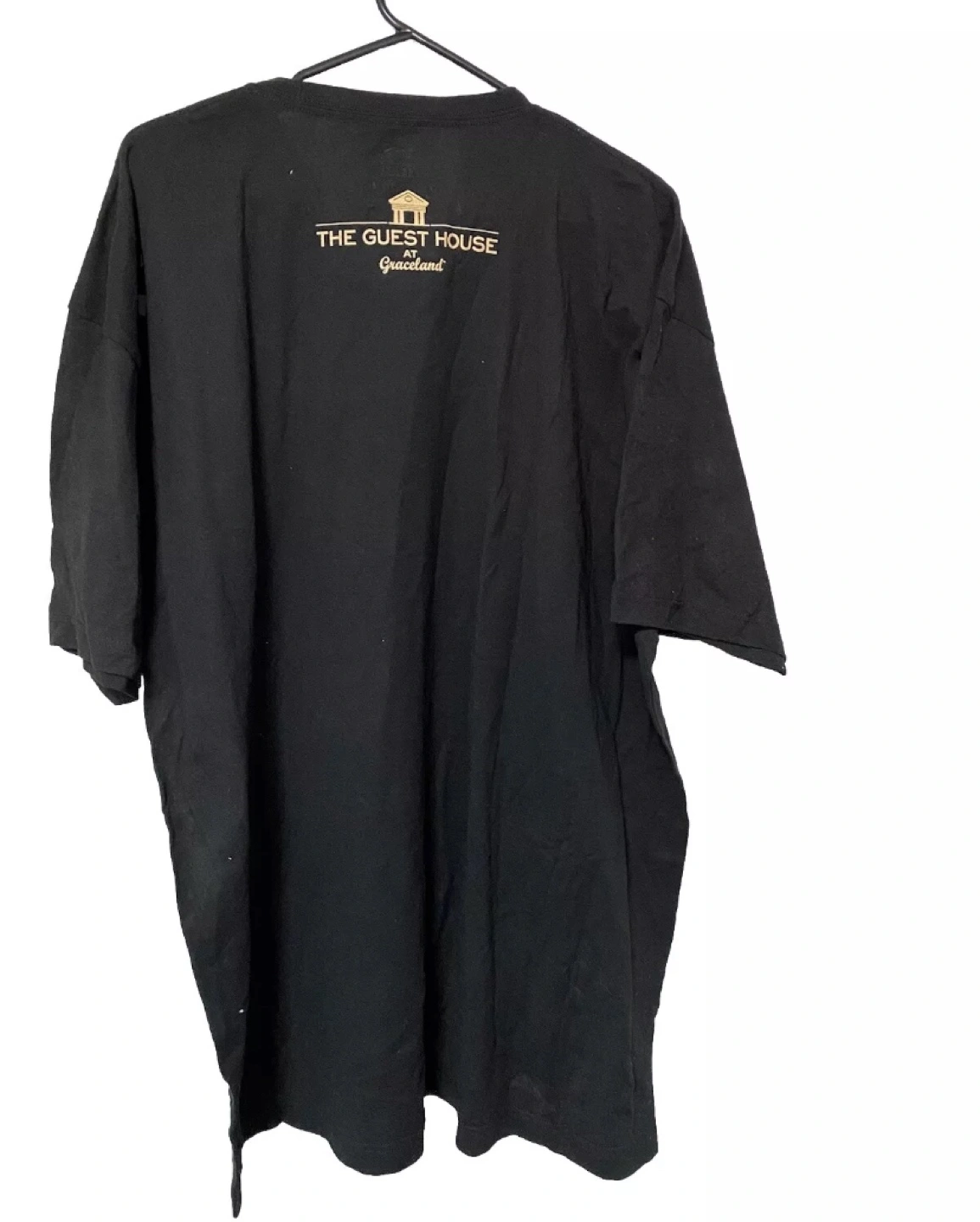 Black t-shirt with a picture of Elvis Presley and his signature. It has a lightning bolt design and the Graceland logo. The back of the shirt says The Guest House Graceland. Size 3XL.