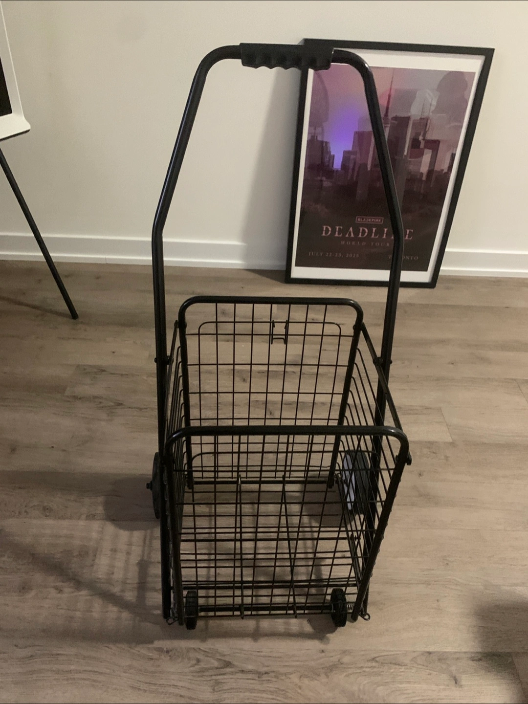 Selling a black folding shopping cart. It's in great condition and ready to help with your grocery runs or any other hauling needs! The cart folds flat for easy storage when not in use. The base measures approximately 11 inches by 15 inches.