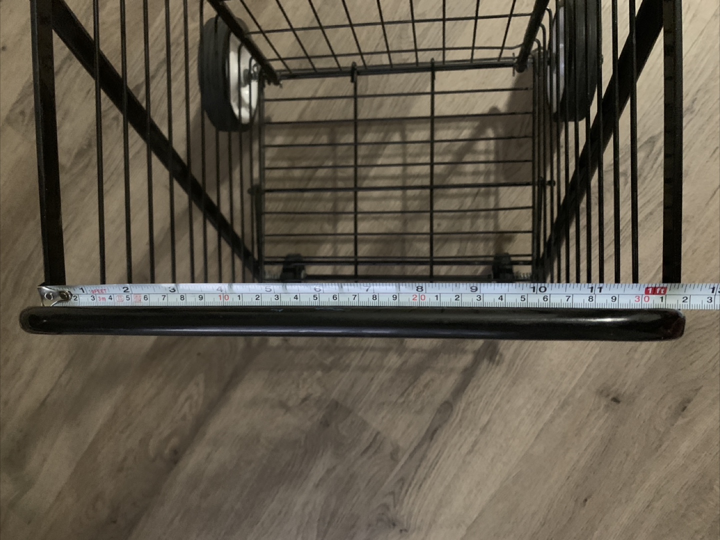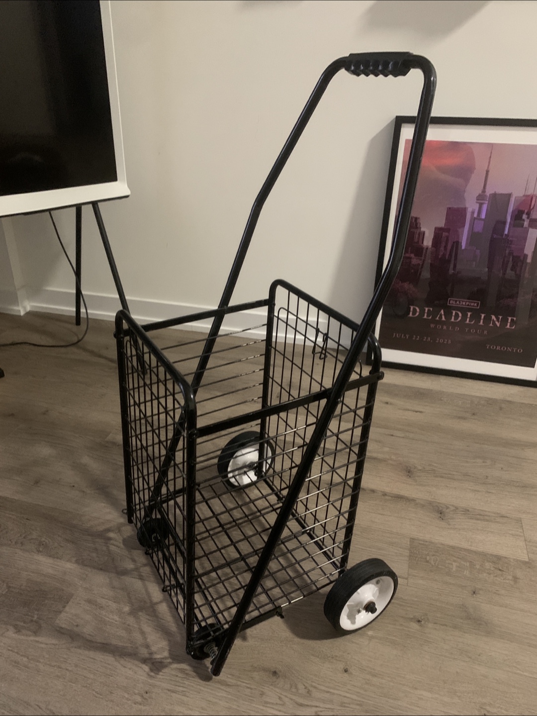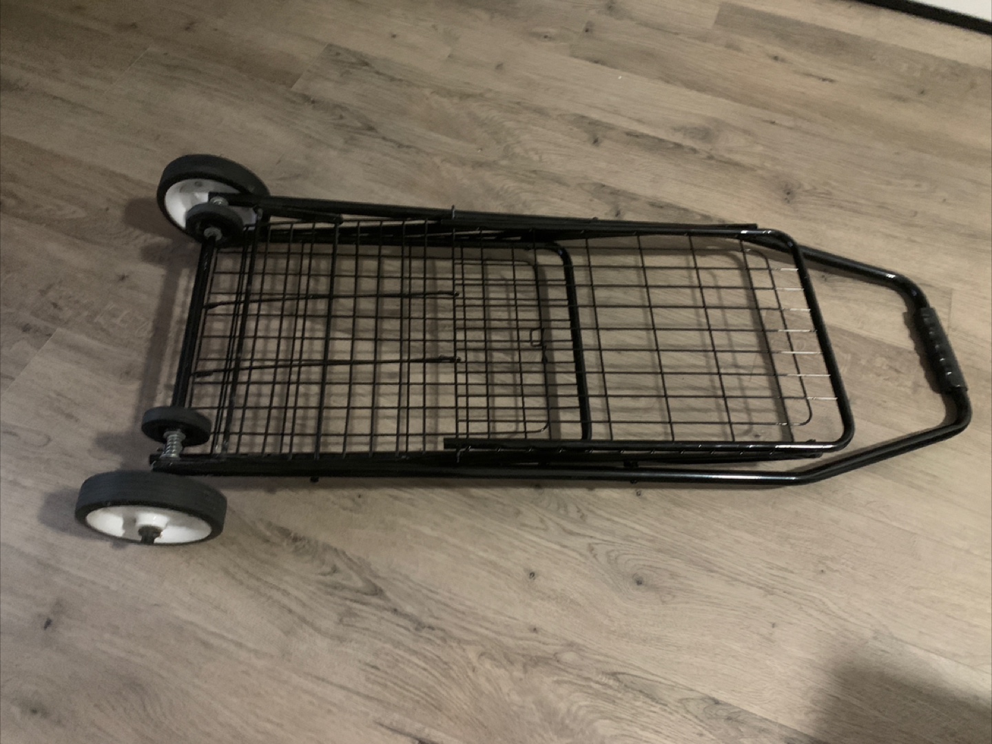 Selling a black folding shopping cart. It's in great condition and ready to help with your grocery runs or any other hauling needs! The cart folds flat for easy storage when not in use. The base measures approximately 11 inches by 15 inches.