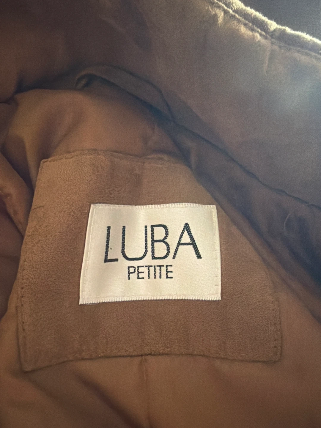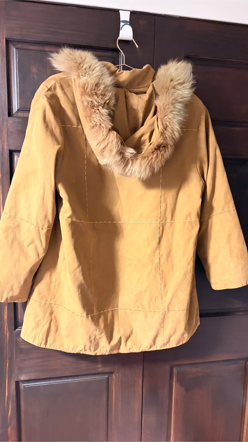 This Luba Petite jacket features a warm tan colour and a cosy faux fur trim on the hood. It's made from a suede-like material and has a zip and button closure. Two zippered pockets are on the front.size large